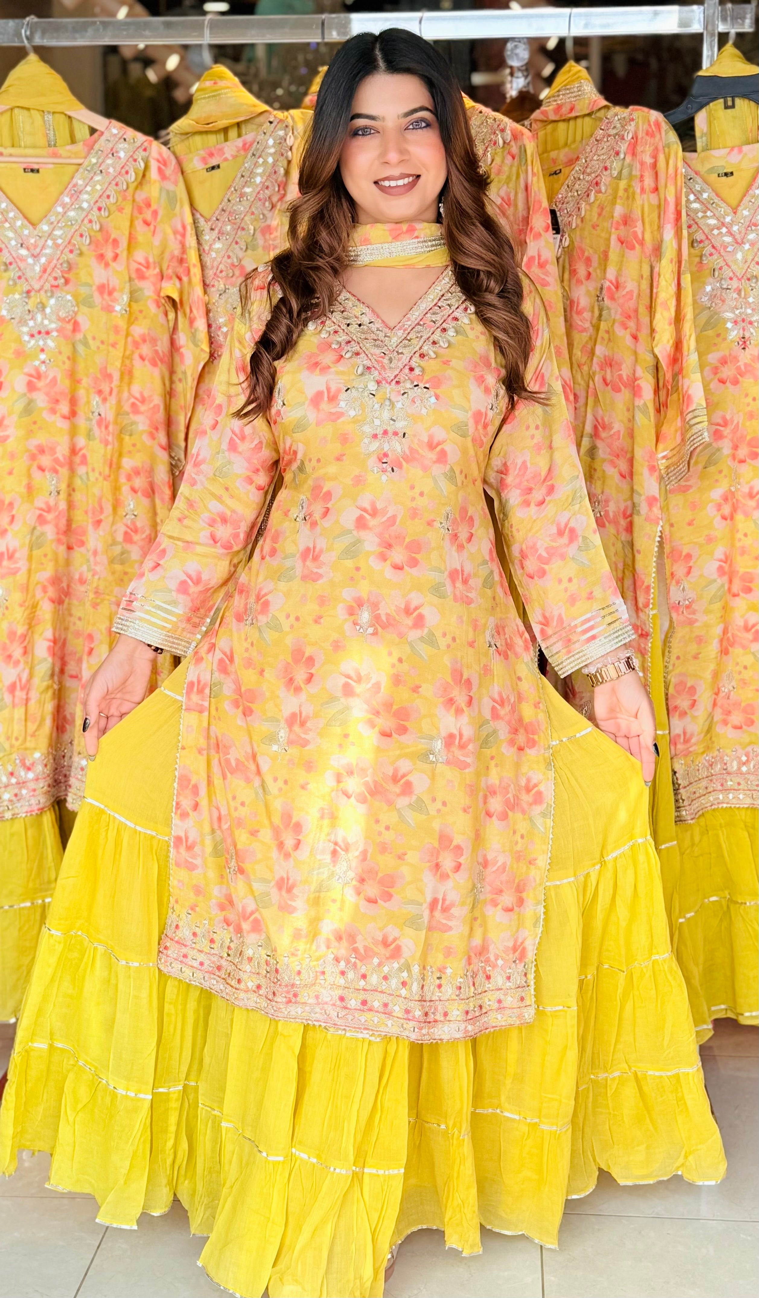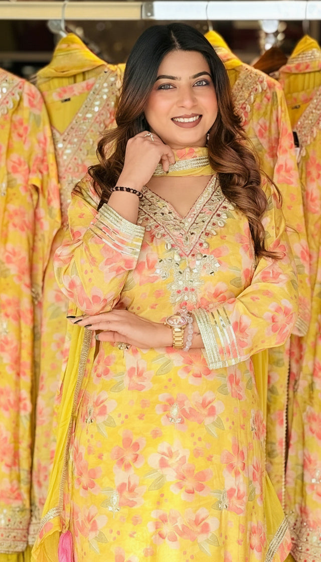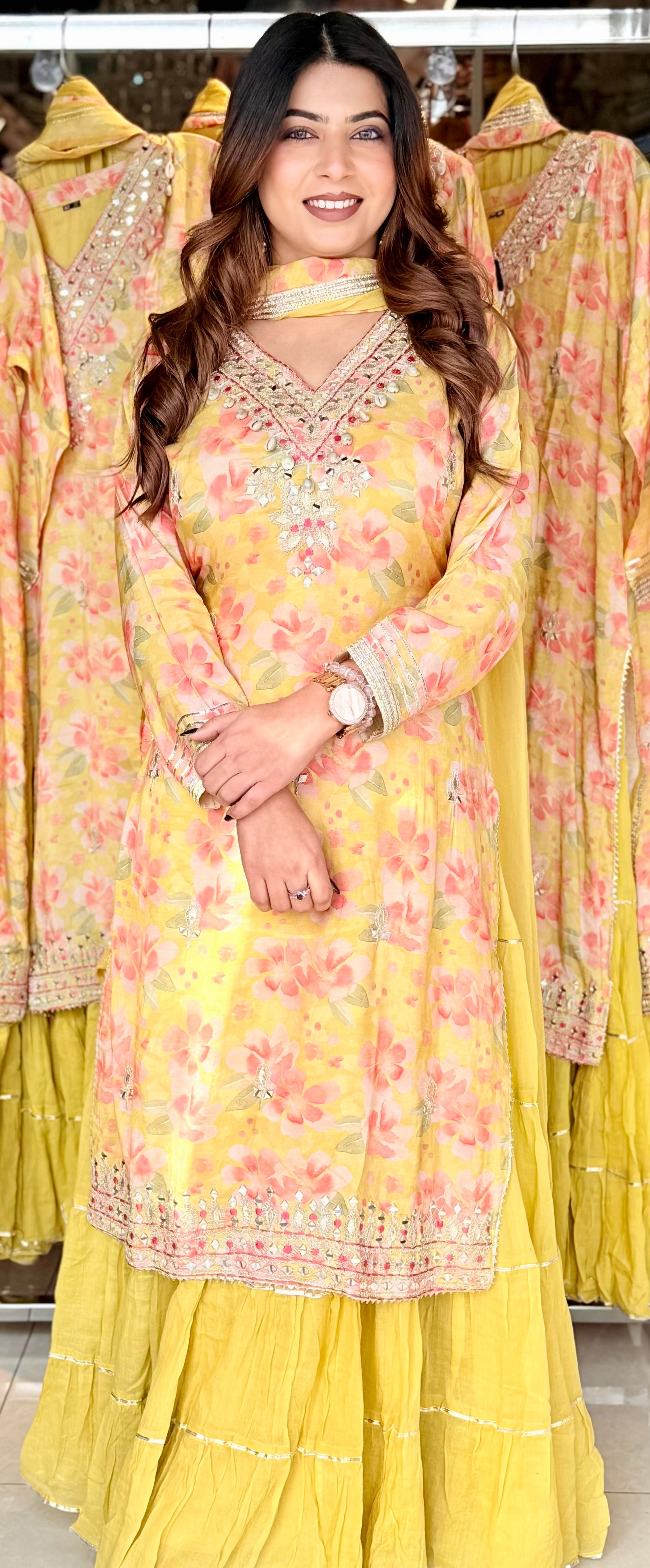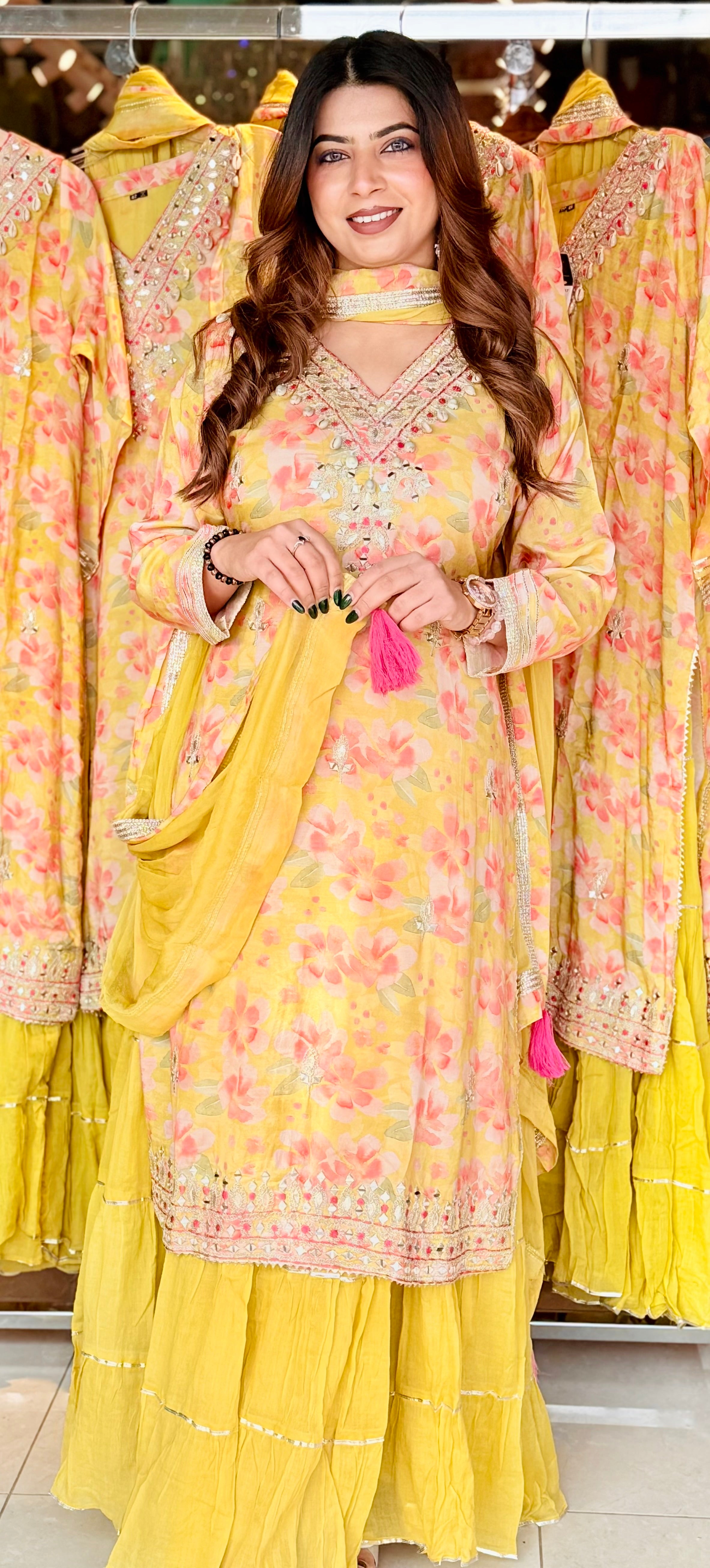 Step into timeless elegance with this pankhuri sharara stunning deep blue suit, adorned with vibrant floral embroidery in shades of red, pink, and ivory. Paired with a flowing sharara and matching dupatta with delicate lace detailing, this outfit beautifully blends tradition with modern grace. Perfect for festive occasions, weddings, and celebrations.”