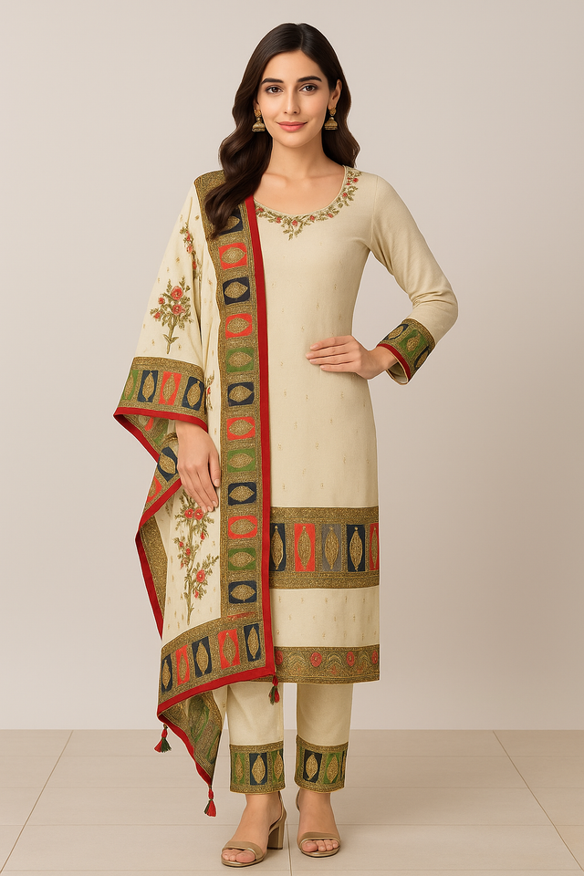 Step into timeless elegance with this beautifully crafted beige ethnic suit set. The outfit features a straight-cut embroidered kurta paired with matching pants and a contrasting printed dupatta. The delicate embroidery, regal borders, and subtle shimmer add a touch of sophistication, making it ideal for festive occasions, get-togethers, or elegant day events.