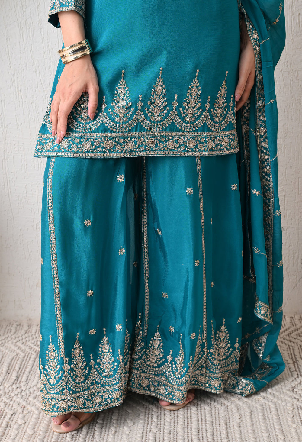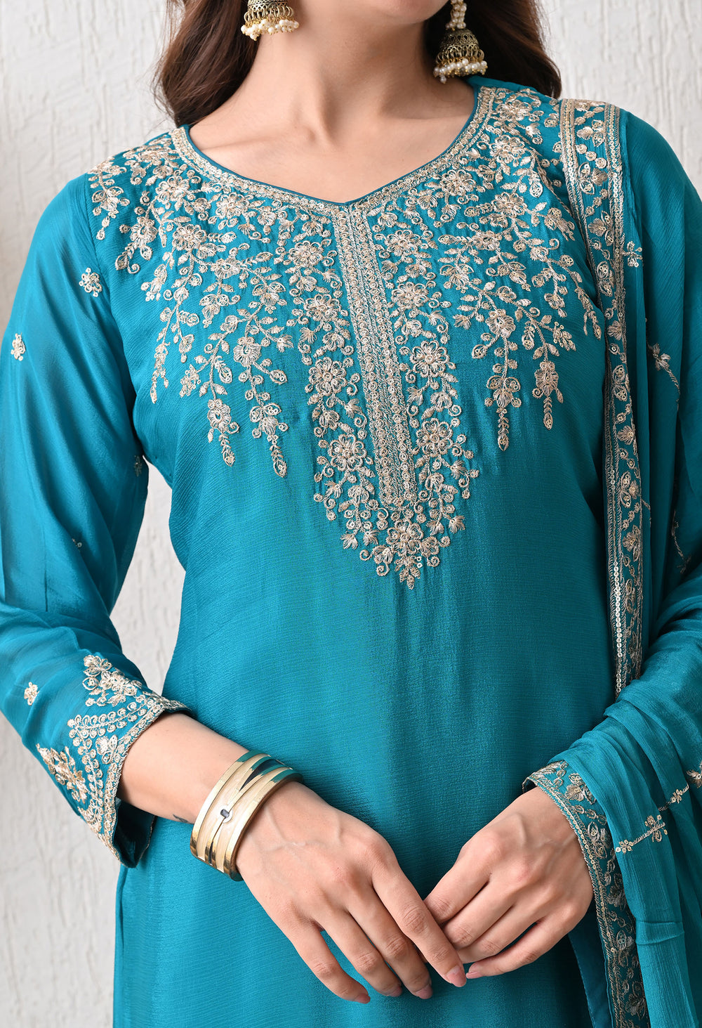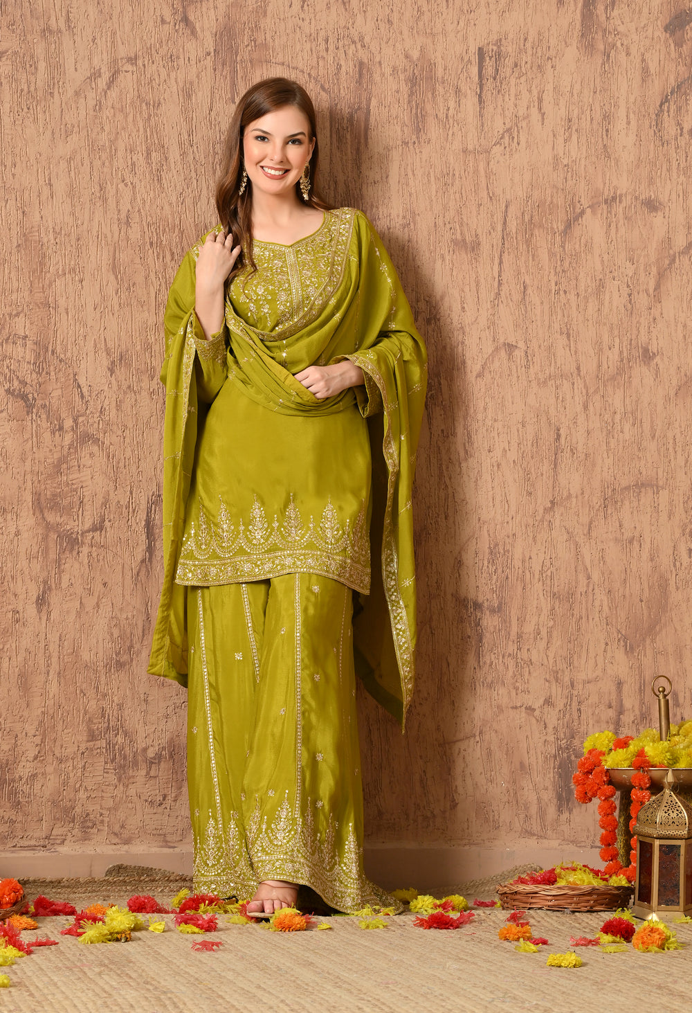 A stunning ethnic ensemble, adorned with intricate embroidery and crafted in a traditional silhouette. This attire combines elegance and festive grandeur, making it perfect for weddings, receptions, and celebratory occasions.