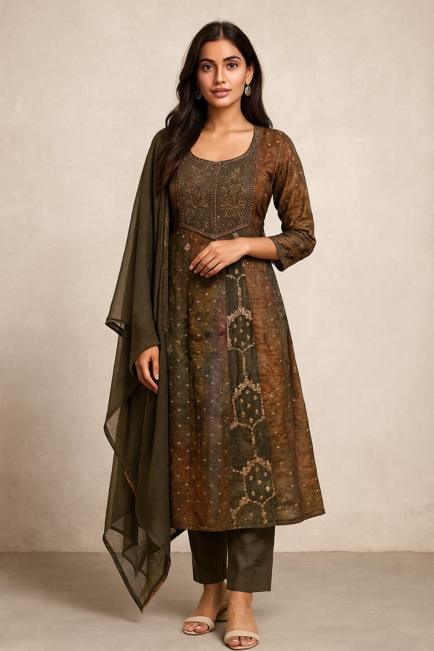 Elevate your ethnic wardrobe with this exquisite olive brown kurta set, a perfect blend of earthy tones and timeless elegance. Featuring delicate embroidery on a printed base, this ensemble radiates understated sophistication. Paired with matching pants and a soft chiffon dupatta, it’s ideal for festive celebrations, family gatherings, or elegant daywear.