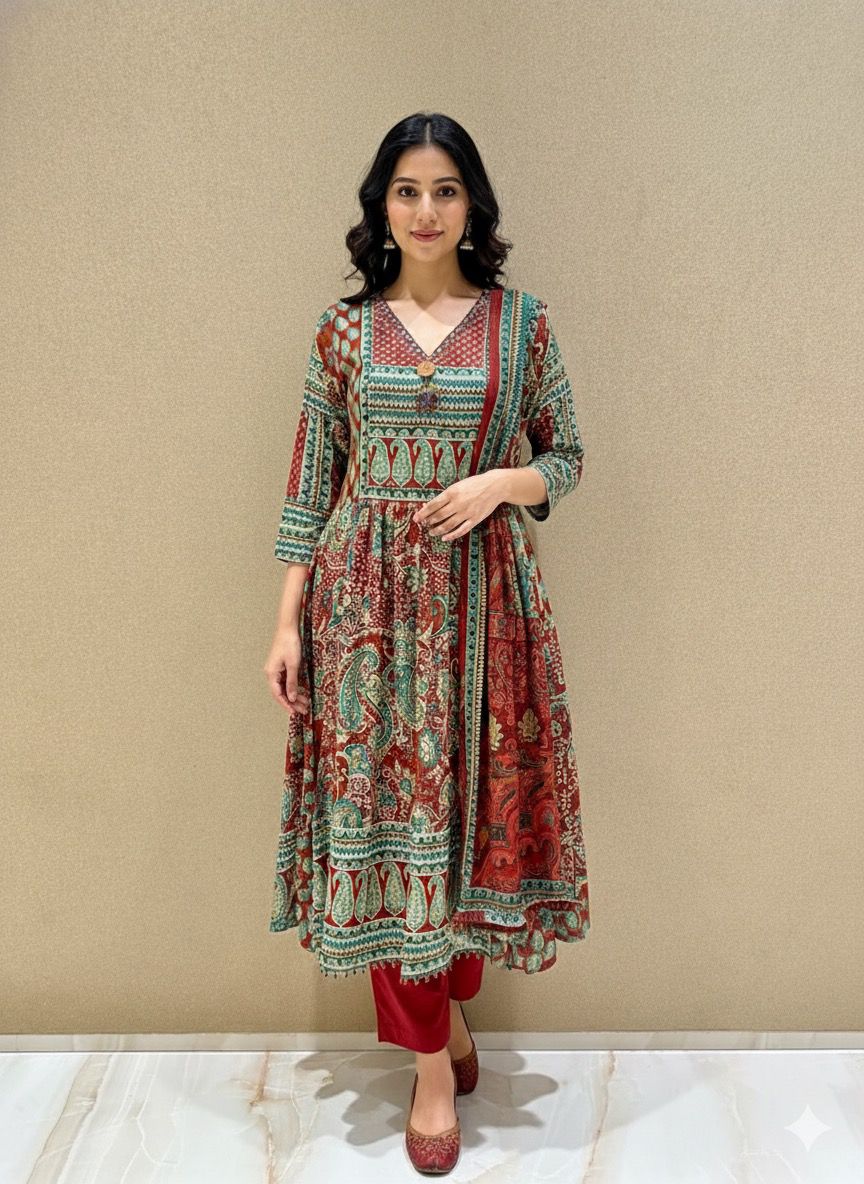 Infuse your wardrobe with traditional charm and comfort with this rust and green printed Anarkali kurta set. Crafted in soft, breathable cotton, it features intricate ethnic motifs and paisley prints all over. The flattering flared silhouette and elegant V-neckline make it a perfect pick for festive gatherings, casual outings, or everyday ethnic wear.