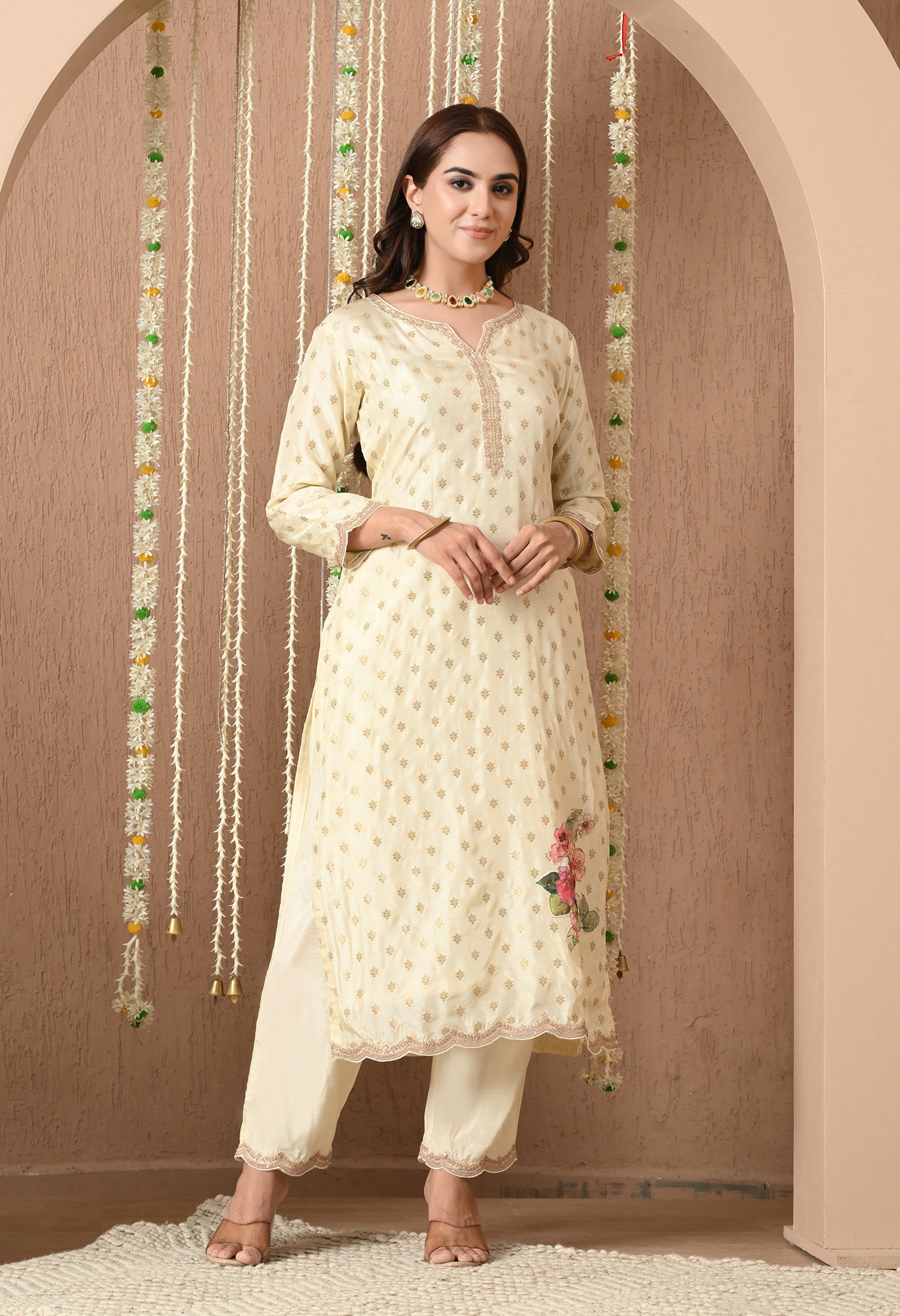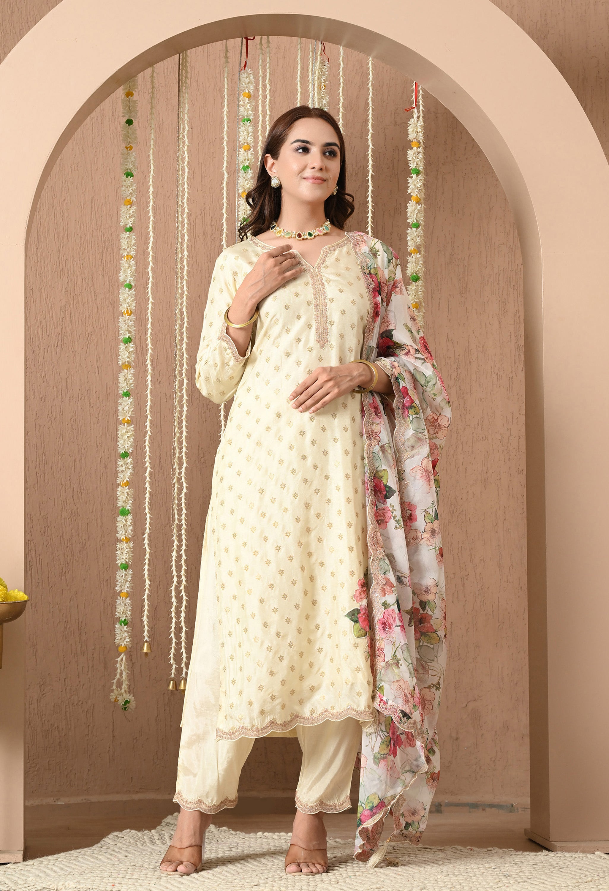 Phoolwari Elegance is a timeless blend of tradition and femininity. Crafted from luxurious Dola silk, the kurta features delicate that exude subtle richness. The santoon bottom ensures ease and flexibility, making it ideal for all-day wear. What steals the show is the ethereal organza dupatta, adorned with blooming floral prints that add a fresh, romantic charm to the look.