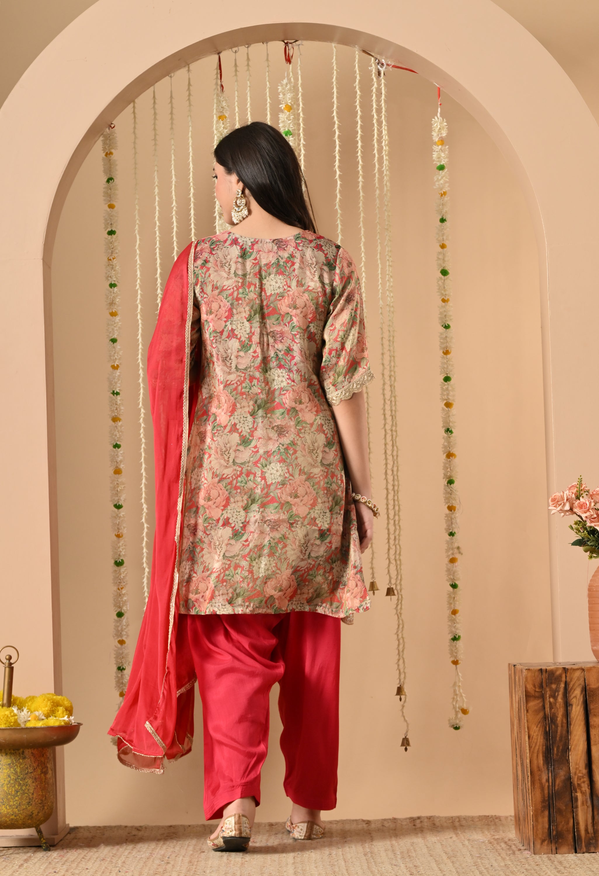 A celebration of festive grace and vintage charm Gulabpari suit, our features a soft floral print kurta in blush pink and olive hues, adorned with intricate sequin work detailing on the hem. Paired with a rich mauve salwar and a matching dupatta, this set effortlessly blends traditional style with contemporary comfort. Ideal for daytime functions, mehendis, or festive brunches.