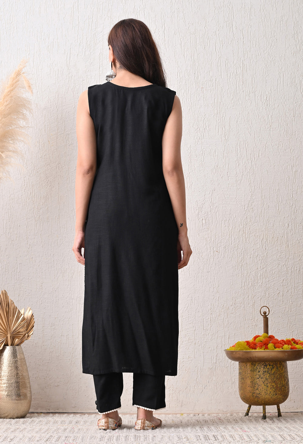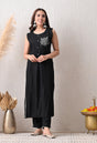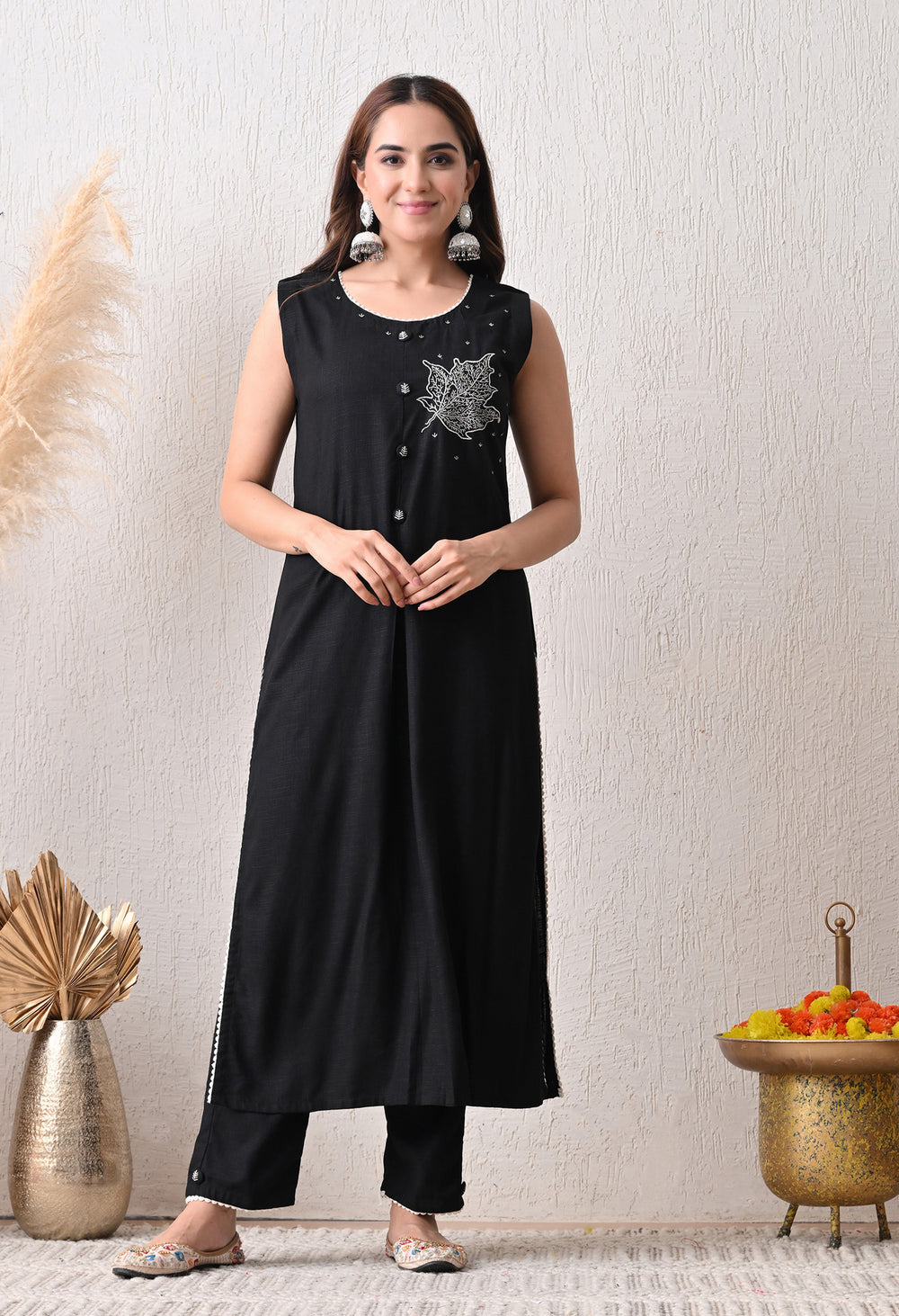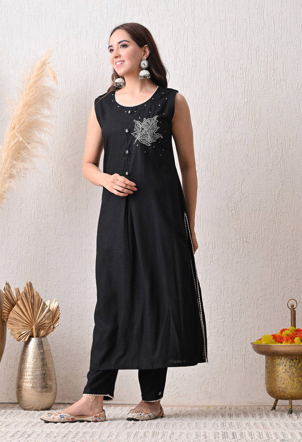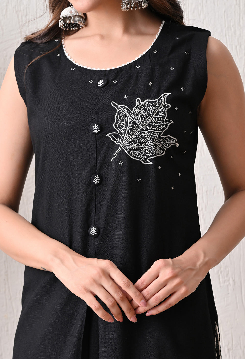 Sleek and sophisticated, our heer raat. brings effortless style to your wardrobe. Crafted in a classic black hue, the sleeveless kurta features delicate buttons and an intricate leaf embroidery on the bodice, paired with straight pants for a modern silhouette. Perfect for casual outings, evening get-togethers, or office wear, this versatile set blends comfort with chic minimalism.