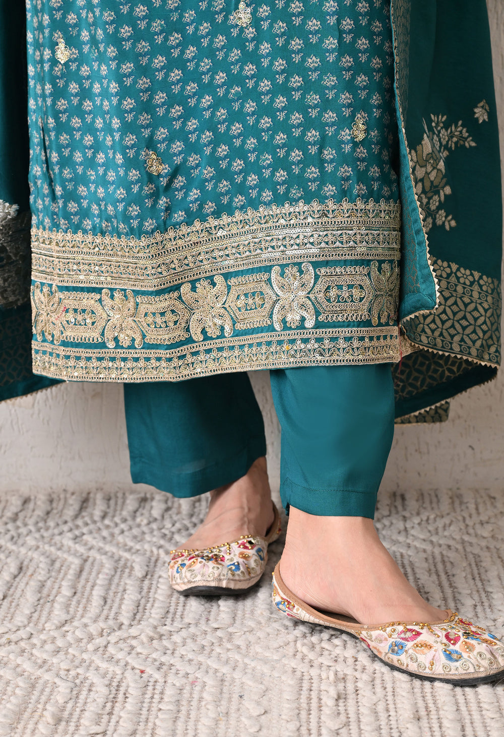 Bring a touch of sophistication to your wardrobe with the Inaaya Embroidered Suit Set. This stunning ensemble features a rich teal-blue kurta adorned with delicate floral embroidery and intricate border detailing.