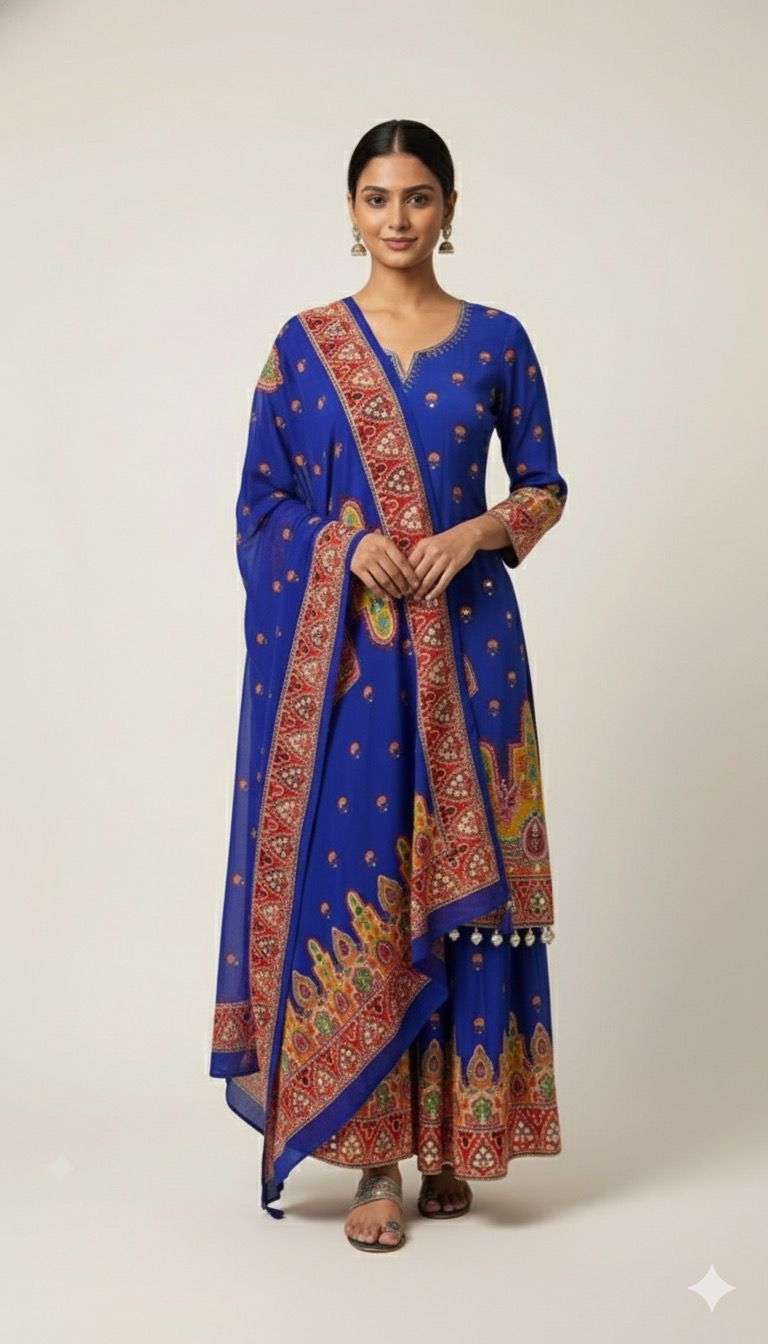 Make a regal statement with this stunning royal blue Bandhej print sharara set. The outfit features a beautifully flared Anarkali-style kurta adorned with traditional Bandhej motifs and an intricately designed border. The matching printed sharara adds volume and elegance, while the lightweight dupatta with contrast border and tassel details completes the festive look. Perfect for weddings, festive celebrations, and cultural occasions, this set combines vibrant colors with timeless ethnic appeal.