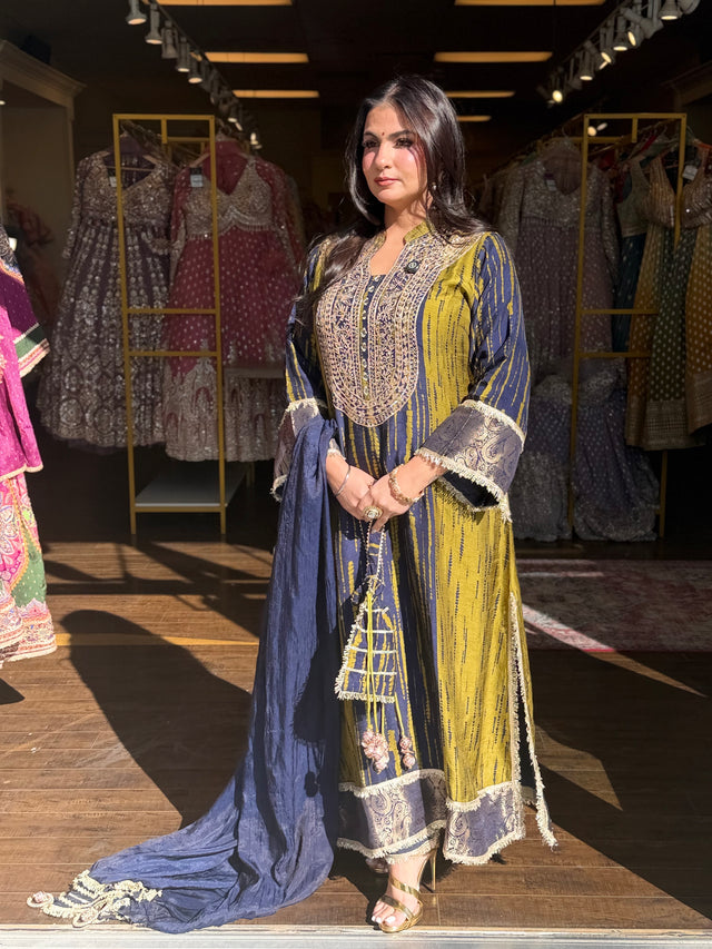 Step into timeless elegance with this graceful embroidered straight suit set, designed for a sophisticated festive look. The kurti features intricate thread embroidery with mirror accents on the neckline, enhanced with vertical stripe detailing that adds a slimming and modern touch.