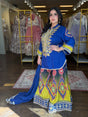 The kurti is paired with a statement sharara featuring vibrant geometric and floral prints, giving it a rich and festive appeal. Completed with a soft, flowy dupatta, this ensemble is perfect for weddings, mehendi functions, and festive celebrations.