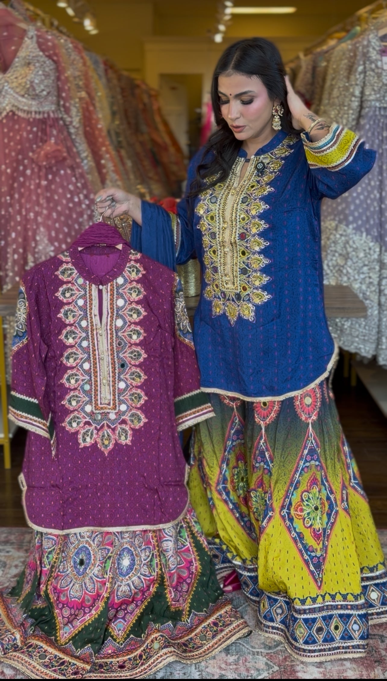 - Bottom: Flowy printed sharara