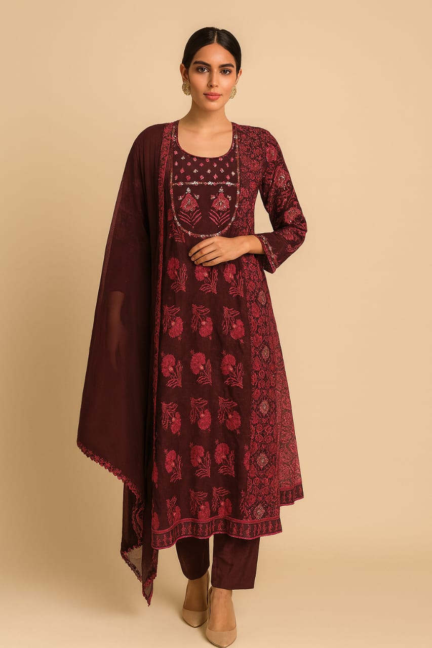 Step into refined elegance with this Maroon Printed Cotton Suit Set, a graceful blend of traditional artistry and contemporary comfort.