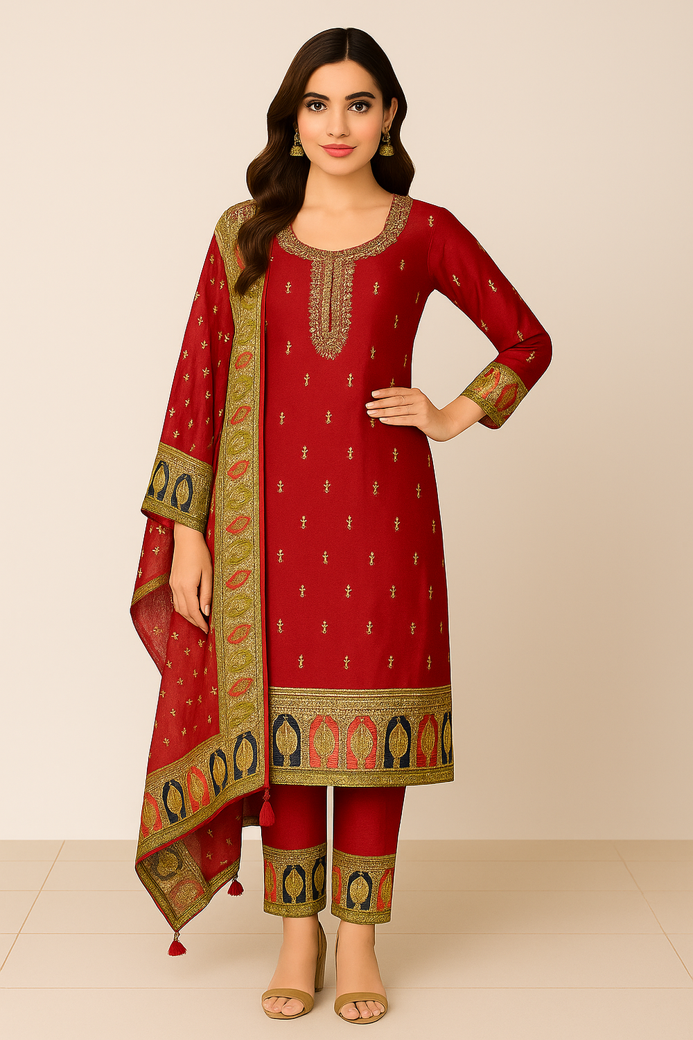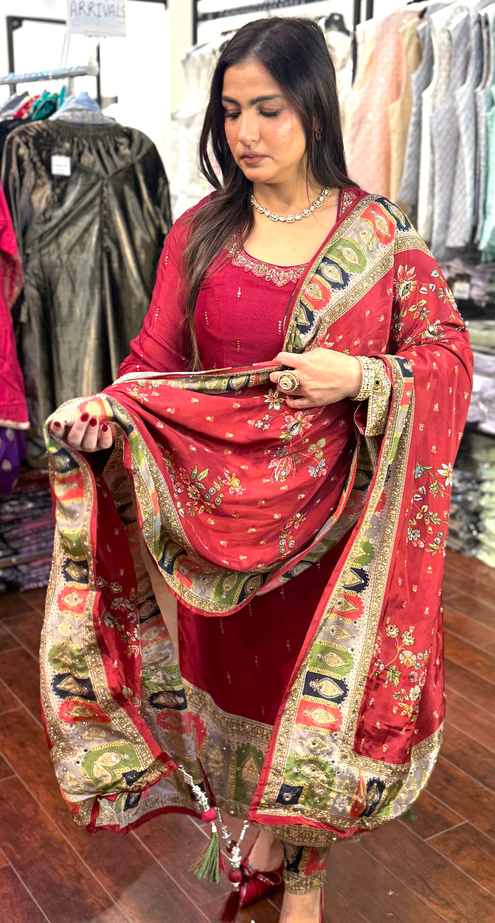 Turn heads with this Maroon Embroidered Silk Suit Set, a masterpiece of tradition and luxury crafted for modern elegance.