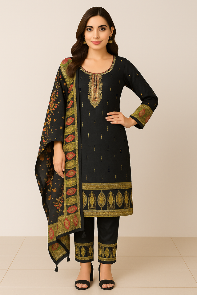 Step into timeless elegance with this Black Embroidered Silk Suit Set, a perfect blend of classic grace and contemporary design.