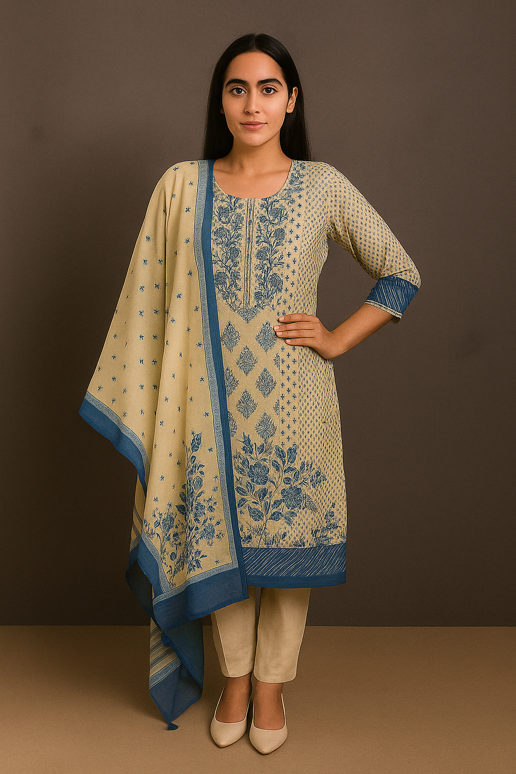 Embrace timeless elegance with this beige and blue printed kurta set, beautifully crafted from soft cotton fabric for all-day comfort. The kurta features intricate block-inspired floral and geometric prints, accentuated with a contrast blue border and detailing on the cuffs. Paired with straight cotton pants and a matching dupatta, this ensemble exudes a perfect balance of traditional charm and modern simplicity — ideal for casual gatherings, festive events, or everyday sophistication.