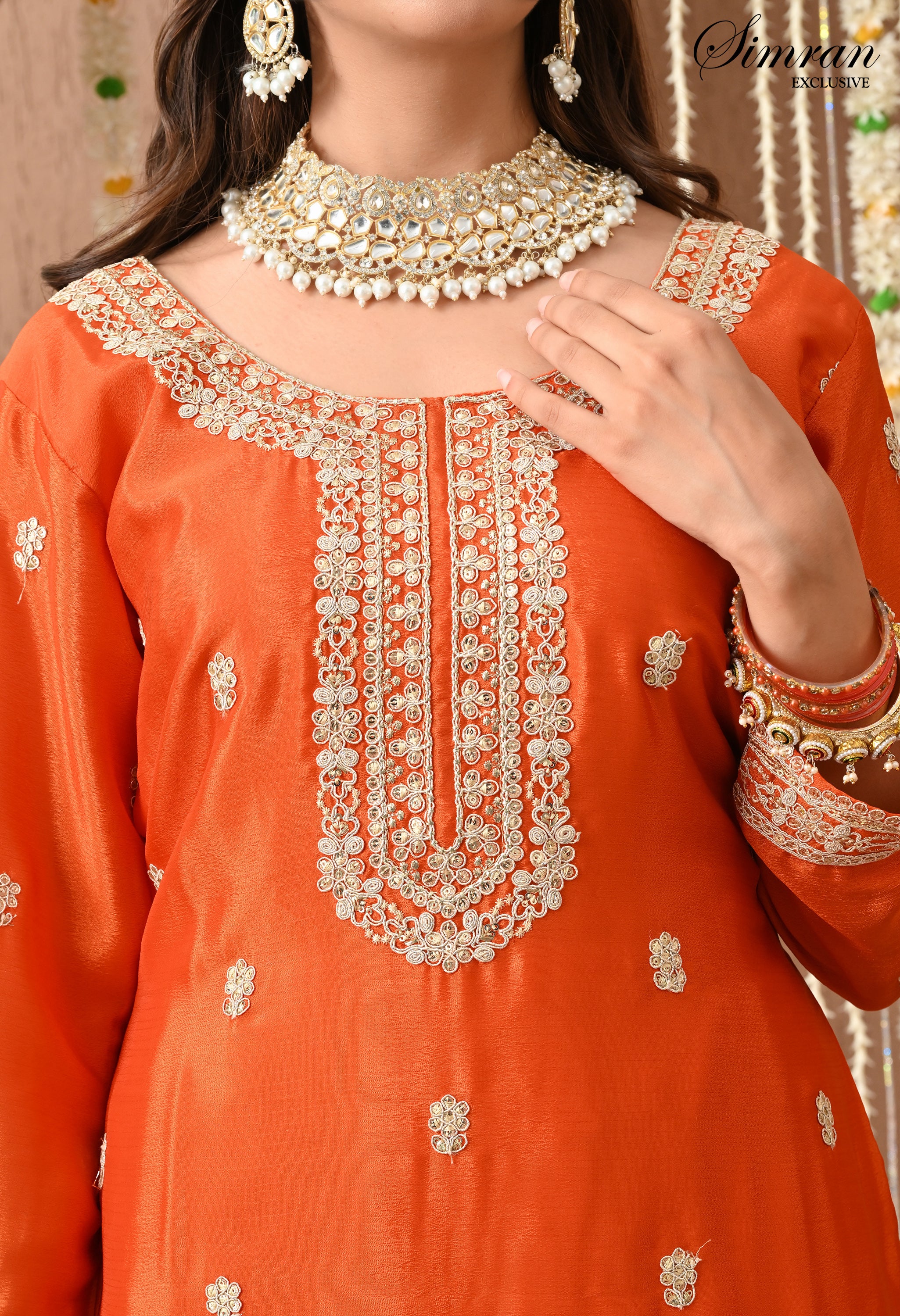 Drenched in a radiant rust hue, the Kesar Zari Sharara Ensemble is a celebration of regal elegance and timeless craft. The straight-cut kurta is beautifully adorned with intricate zari and thread embroidery.The sharara is beautifully adorned with delicate motifs and heavy lace borders, adding a regal touch to your celebrations. Perfect for weddings, mehendi, or festive gatherings – this look pairs tradition with unmatched.