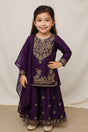 Dress your little girl in timeless elegance with this royal purple embroidered sharara set, perfect for festive occasions, weddings, and celebrations. Made from luxurious chinon silk fabric, this outfit offers a smooth, comfortable feel with a subtle sheen that enhances its festive charm.