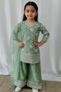 3-piece kids formal wear suit with embroidered shirt, wide-leg bottom & matching dupatta.