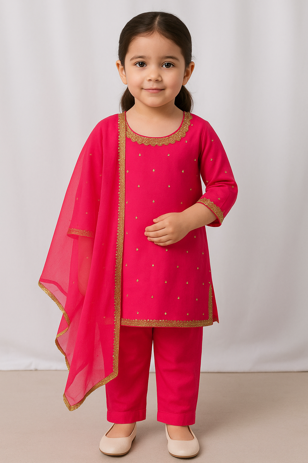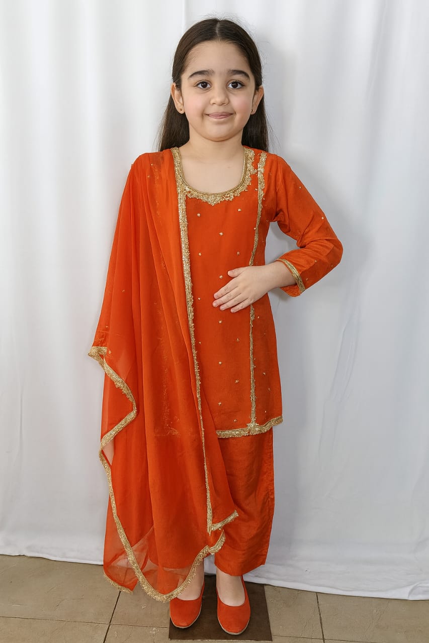 This elegant kids’ ethnic suit features a soft georgette/chiffon kurta adorned with delicate gold butti motifs for a subtle festive shine. The kurta is finished with a beautifully detailed gold lace border along the neckline, sleeves, and hem, adding a classic traditional touch. It comes paired with straight-fit trousers made from comfortable soft-grip fabric, ensuring easy movement for your little one. The look is completed with a lightweight chiffon dupatta edged with matching gold lace, creating a perfectly coordinated festive outfit ideal for weddings, parties, and celebrations.