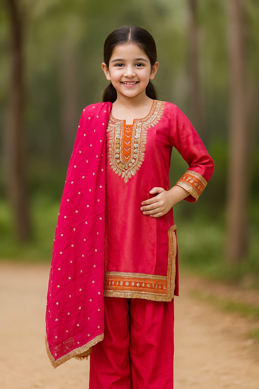 Dress your little one in timeless elegance with this beautifully crafted ethnic set. Featuring a premium cotton-silk kurta adorned with intricate zari embroidery, matching straight pants, and a graceful dupatta, this outfit blends tradition with comfort.