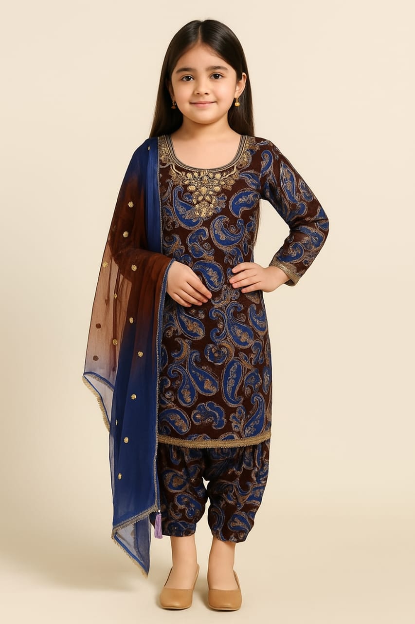 Coordinated velvet Patiala-style salwar with matching paisley patterns, offering comfort and ease of movement while enhancing the ethnic appeal.
