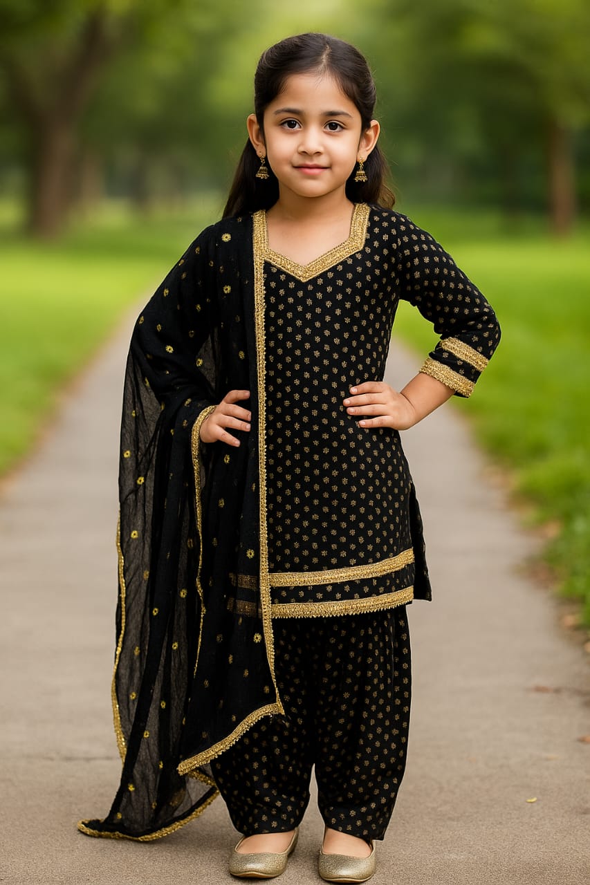 Make your little one shine in this stunning black Patiala suit set, crafted from soft and breathable cotton-blend fabric. The kurta features beautiful golden printed motifs paired with rich lace detailing on the neckline, sleeves, and hem.
