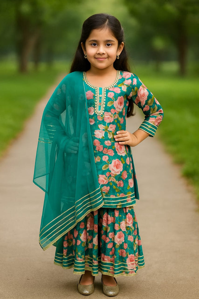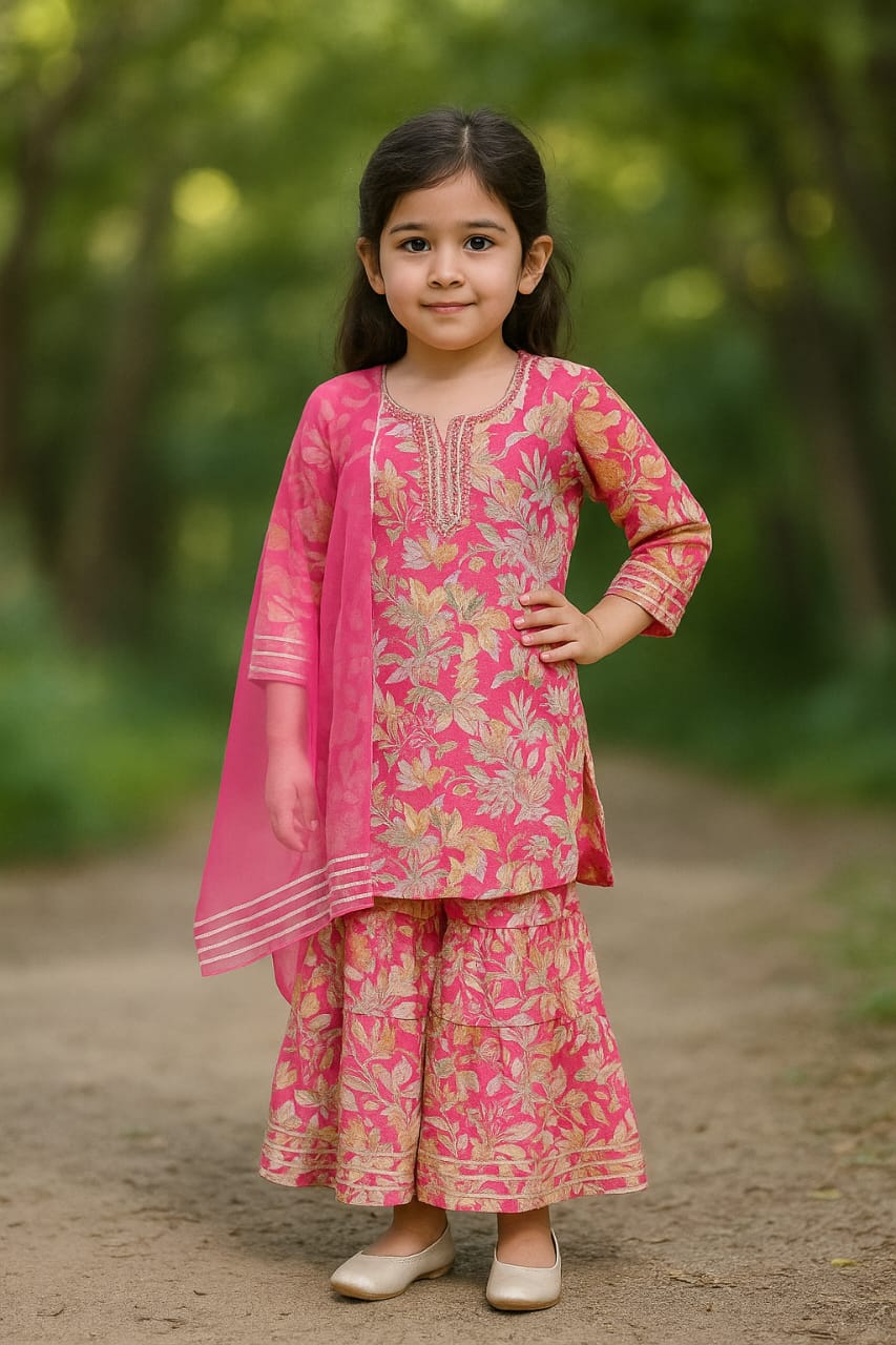 Dress your little one in blooming festive charm with this beautiful floral Kurta–Sharara set. Crafted from soft and breathable rayon-blend fabric, this outfit ensures all-day comfort while offering an elegant, flowy drape.