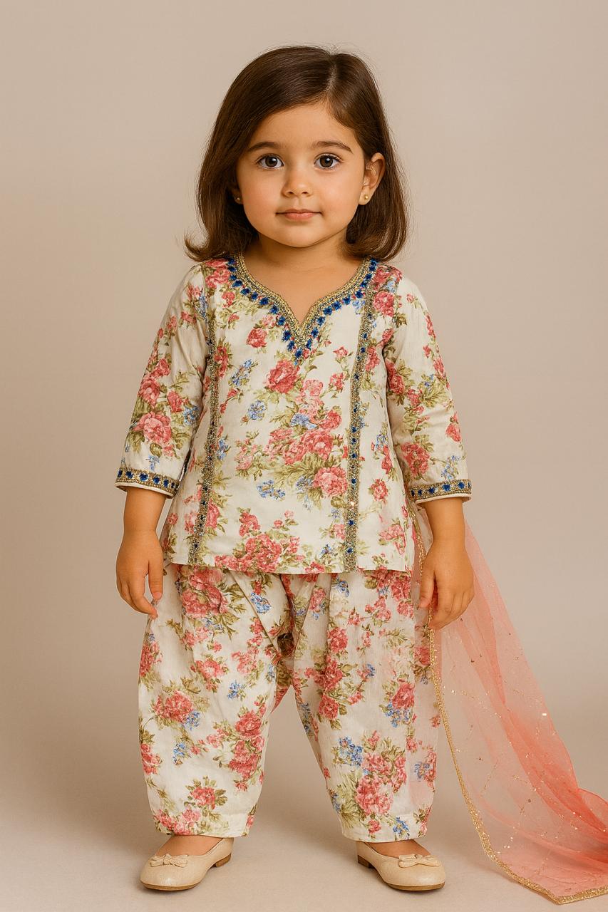 Dress your little girl in timeless elegance with this floral printed patiala set, crafted from soft and lightweight georgette fabric that offers both comfort and style. Perfect for festive occasions, weddings, and family gatherings, this outfit blends traditional charm with a modern touch.