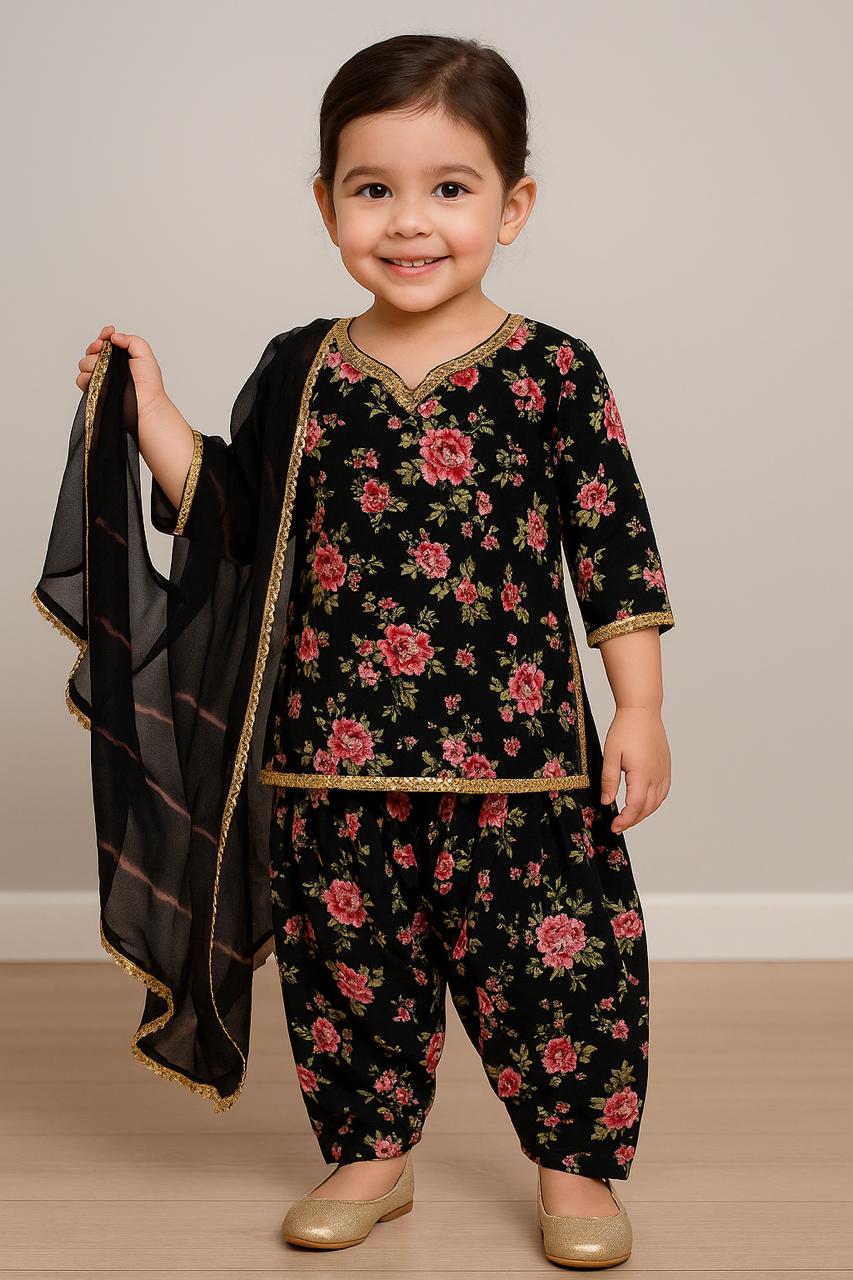 Add a touch of elegance to your little one’s ethnic wardrobe with this Black Floral Georgette Patiala Suit Set. Tailored from soft and lightweight georgette fabric, this outfit ensures comfort with a graceful drape that’s perfect for festive and family occasions. The kurti features charming red and pink floral prints with a gold lace border on the neckline, sleeves, and hemline, lending a regal appeal to the ensemble.