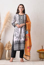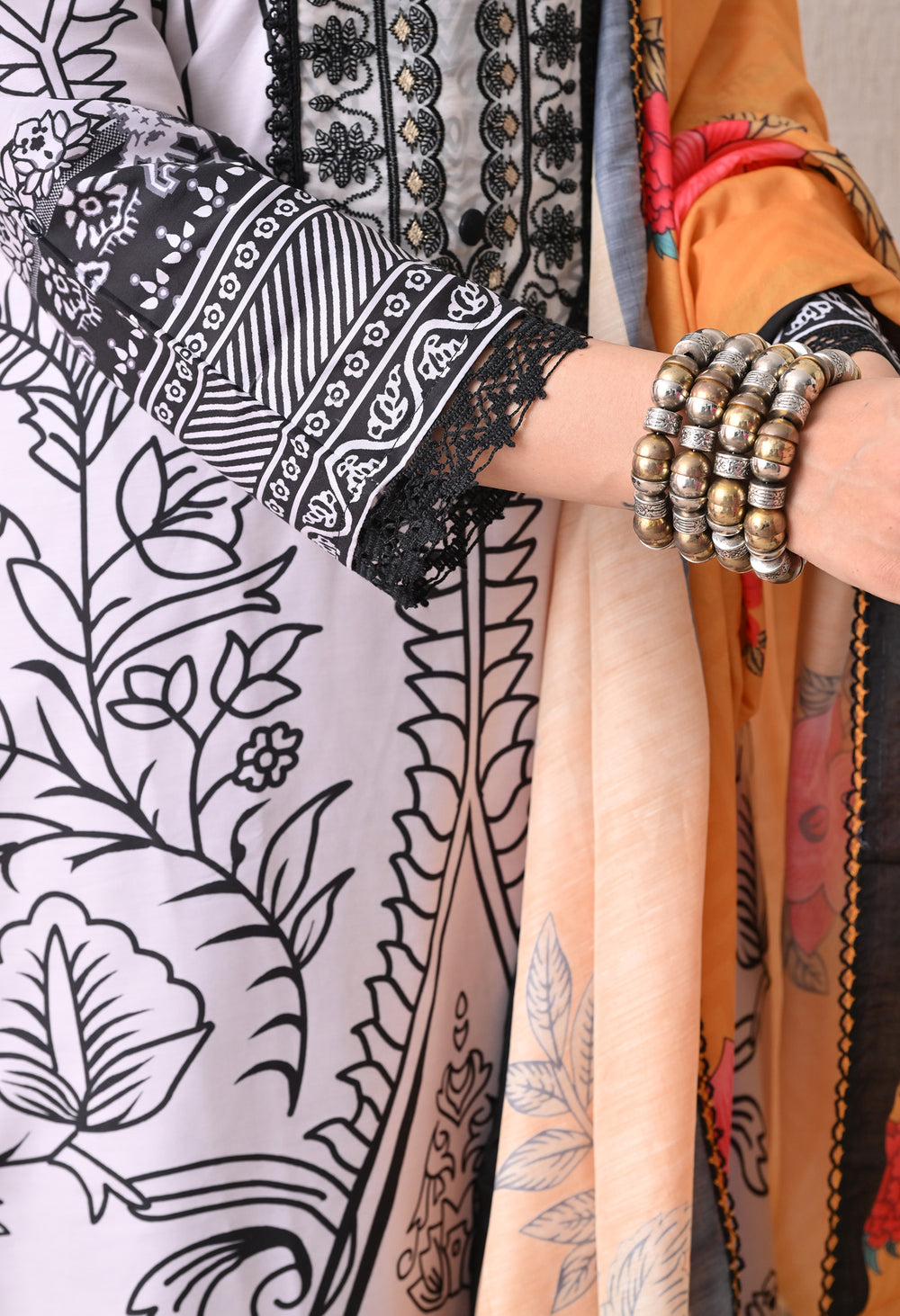 Step into timeless sophistication with the Kohinoor Print Suit, a perfect blend of classic black-and-white prints and vibrant charm. The intricately patterned kurta features bold ethnic and delicate button detailing, paired with sleek black trousers for a refined look. The highlight of this ensemble is the contrasting mustard-orange chiffon dupatta adorned with colorful floral prints, adding a pop of brightness and festive flair. Ideal for casual gatherings, festive lunches, or office ethnic days, this suit offers elegance with a hint of playfulness.