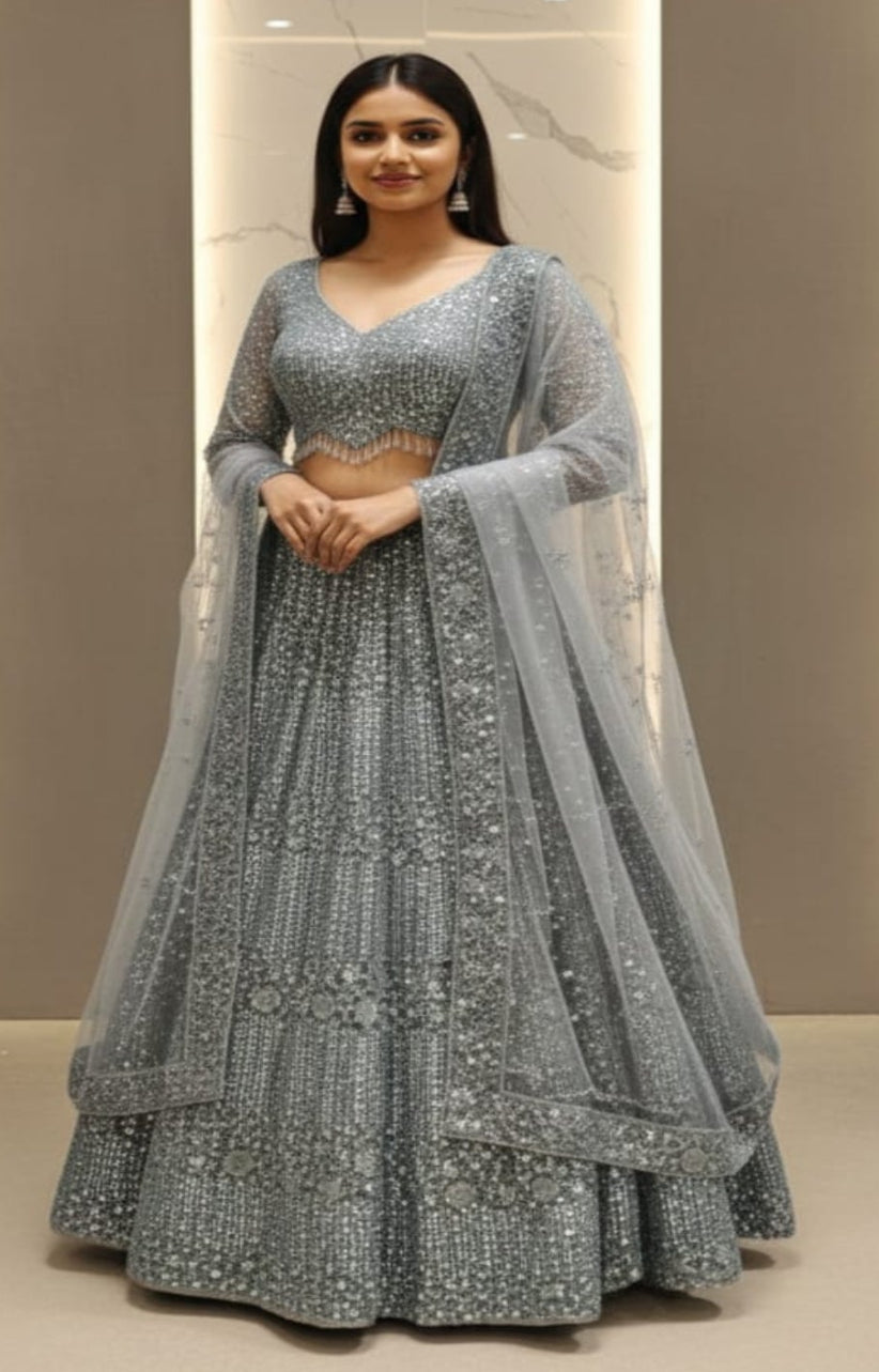 High-quality net and silk blend base with a soft net dupatta, fully enhanced with sequins and bead embellishments.