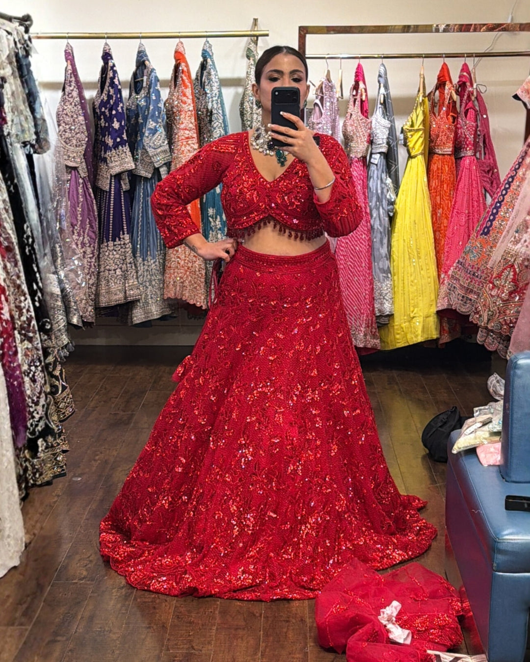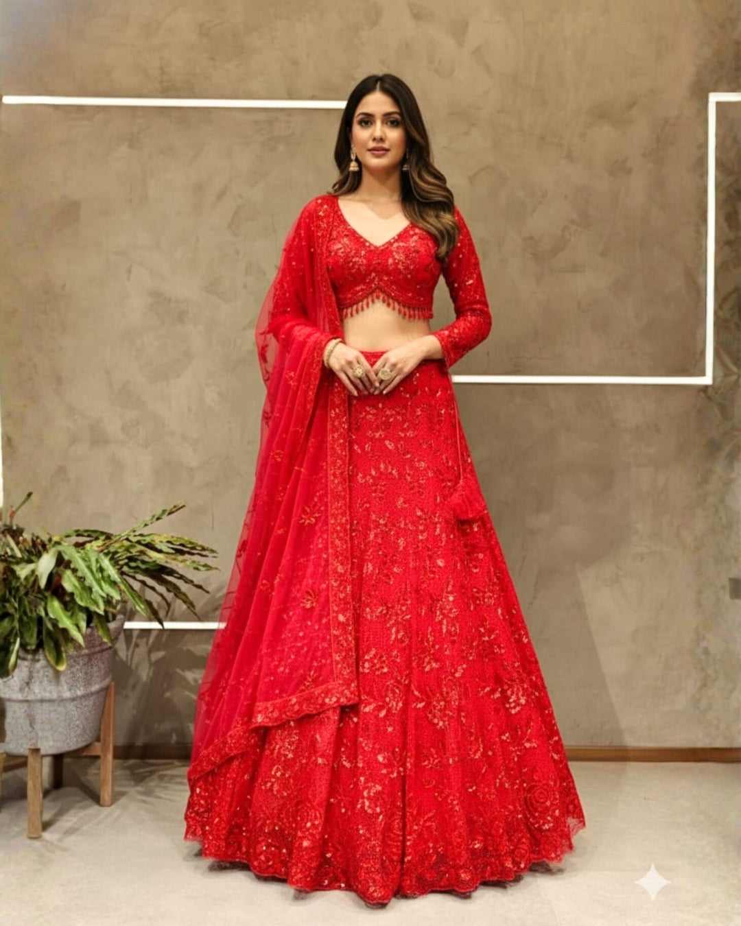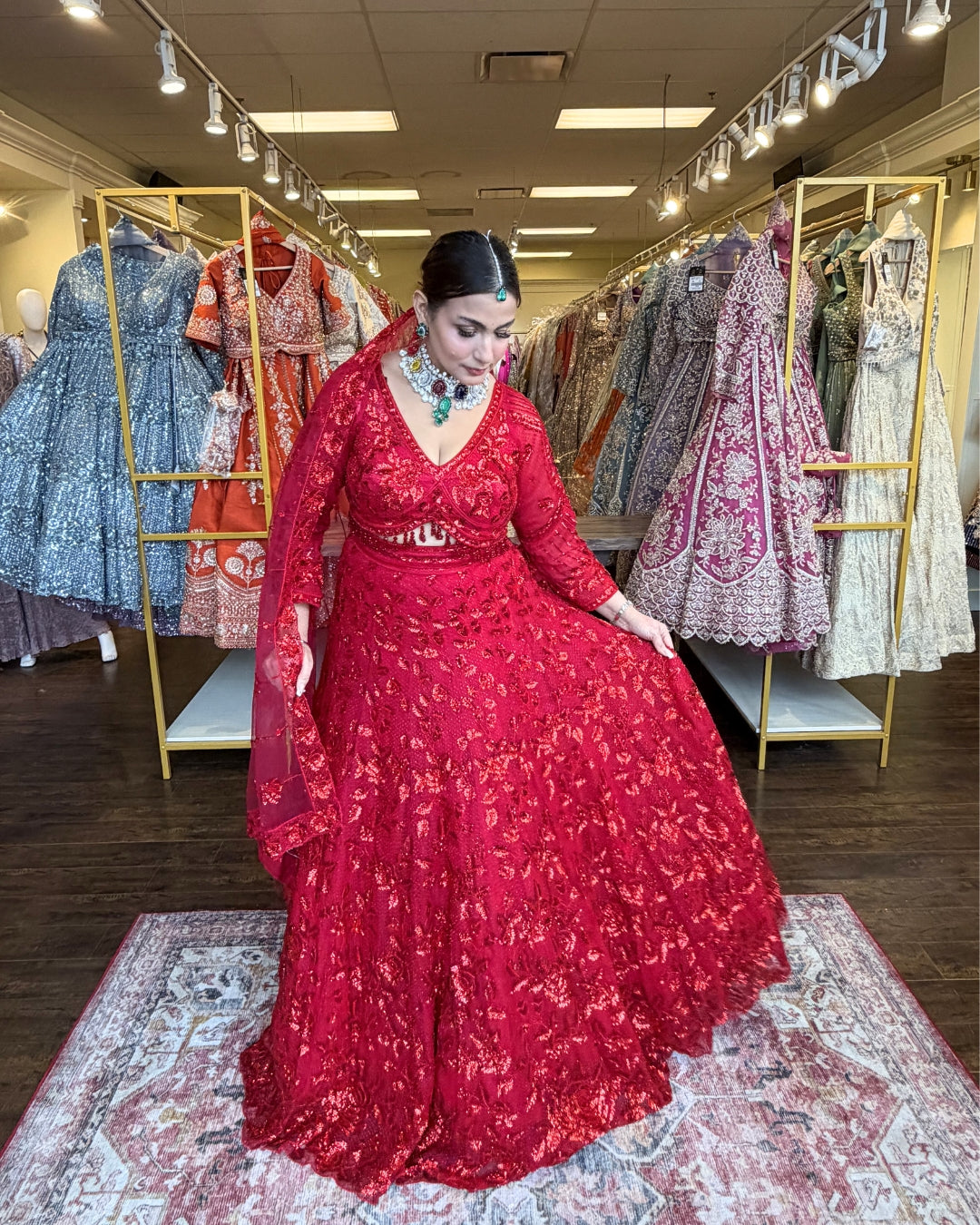 Bottom: Flared lehenga skirt with rich embroidered detailing