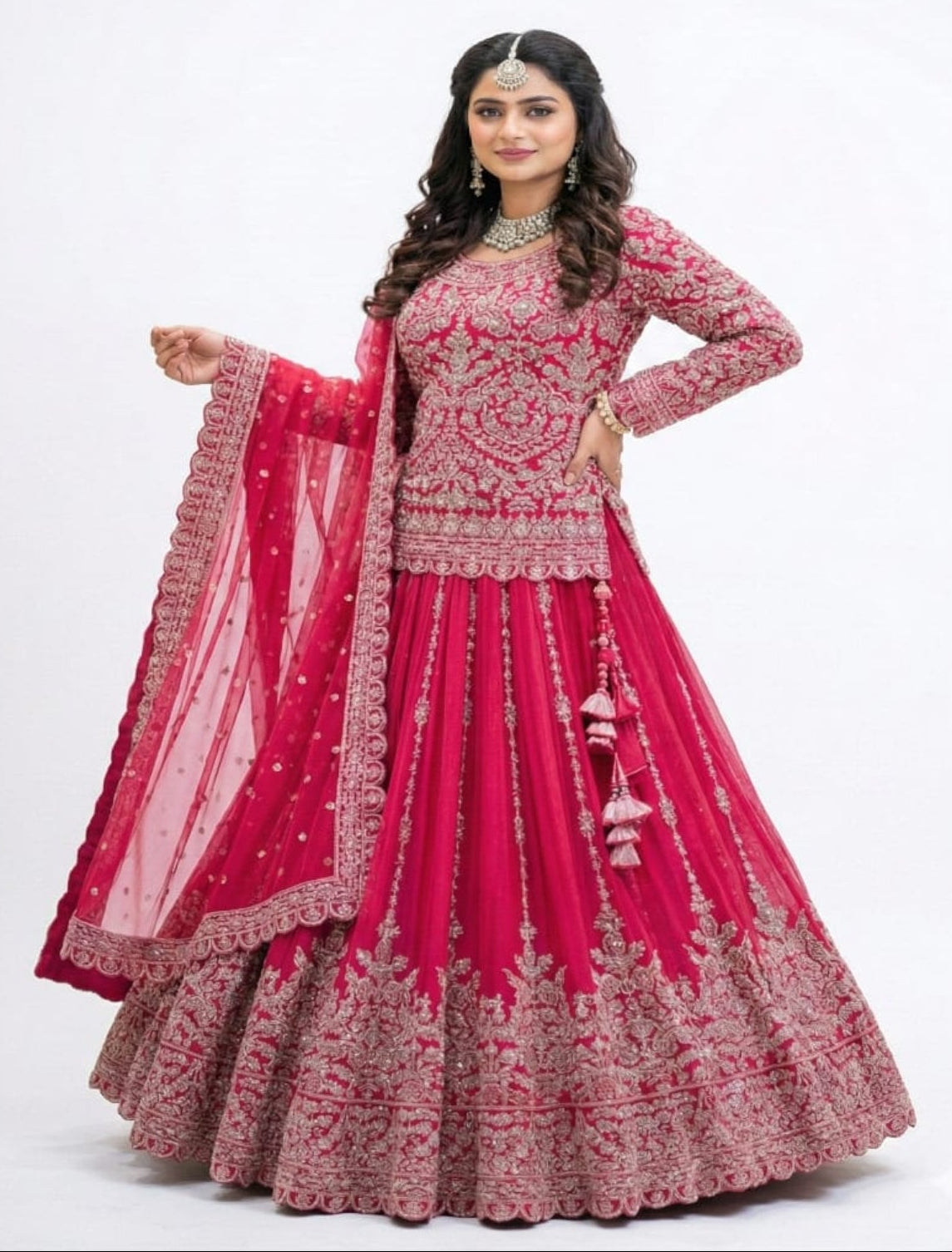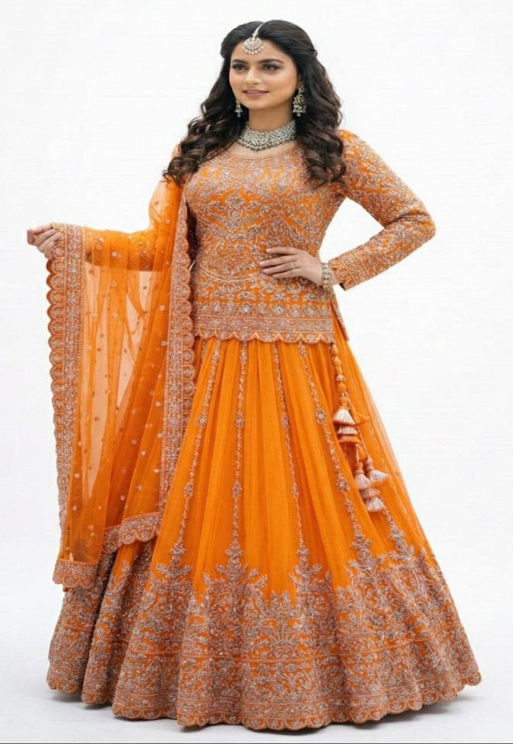 Bottom (Lehenga): Flared Net Lehenga with rich embroidered hem