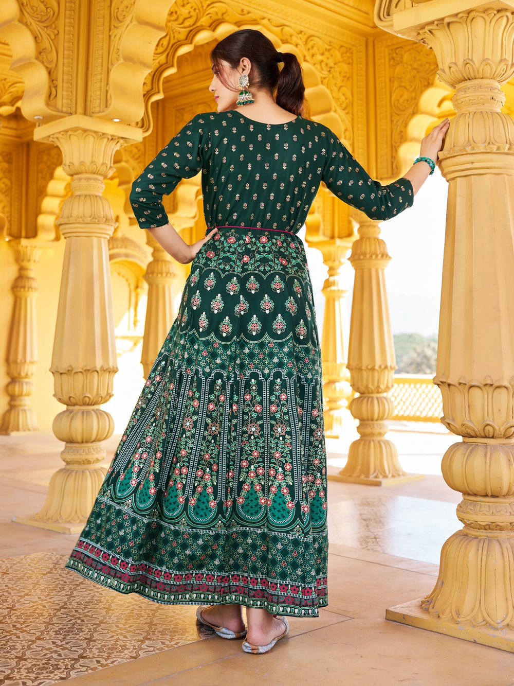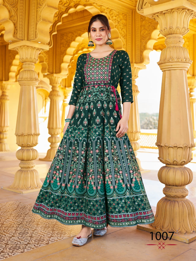“Green embroidered flared kurti – available in sizes 38–46.”