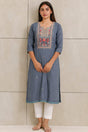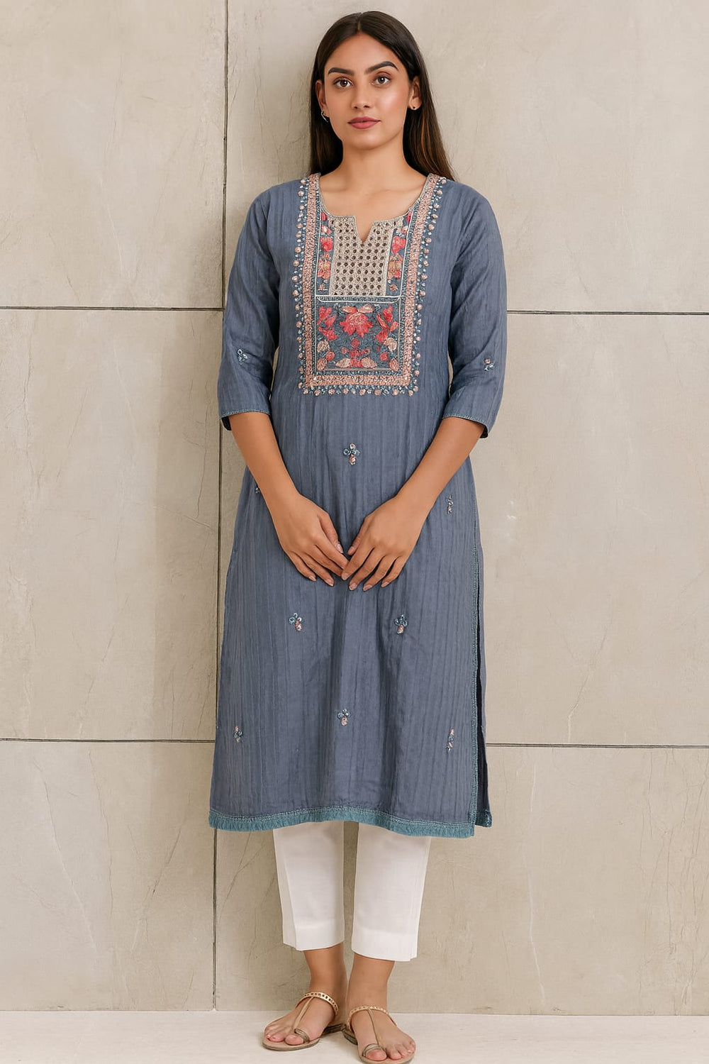 Straight-fit, calf-length kurti featuring a vertical slub texture and a richly embroidered front yoke with detailed floral threadwork.