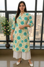 Add a refreshing touch to your everyday wardrobe with this beautiful pure cotton floral printed kurti. Designed with vibrant teal roses and leafy olive motifs, this kurti offers a perfect blend of comfort and elegance. The breathable cotton fabric keeps you cool throughout the day, while the straight silhouette flatters every body type.