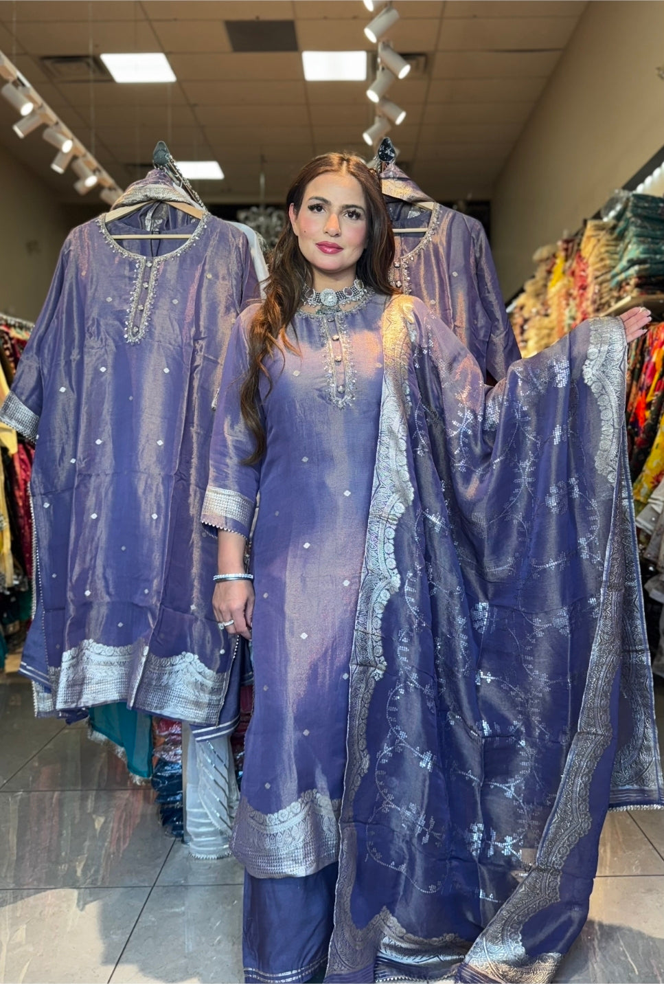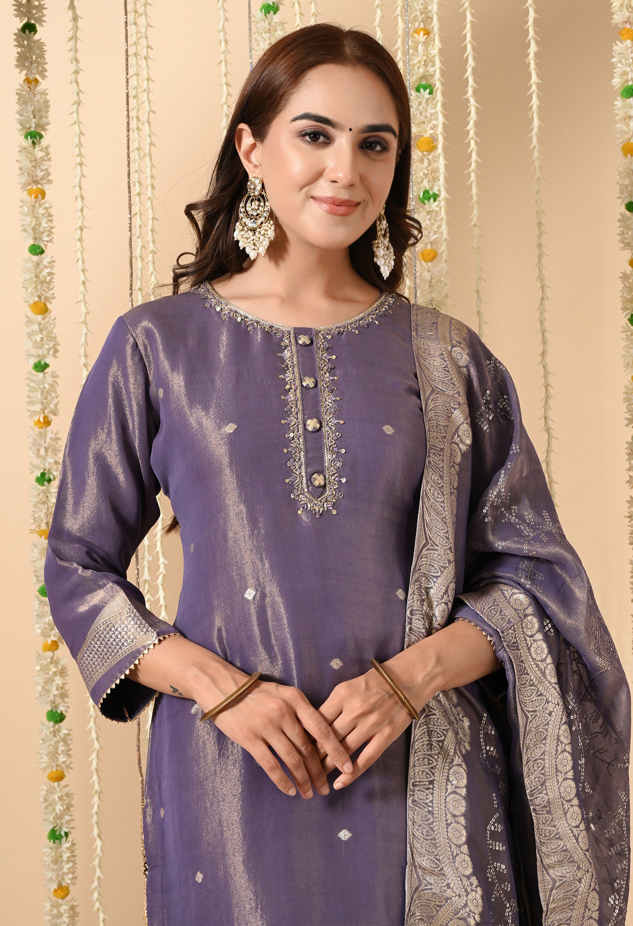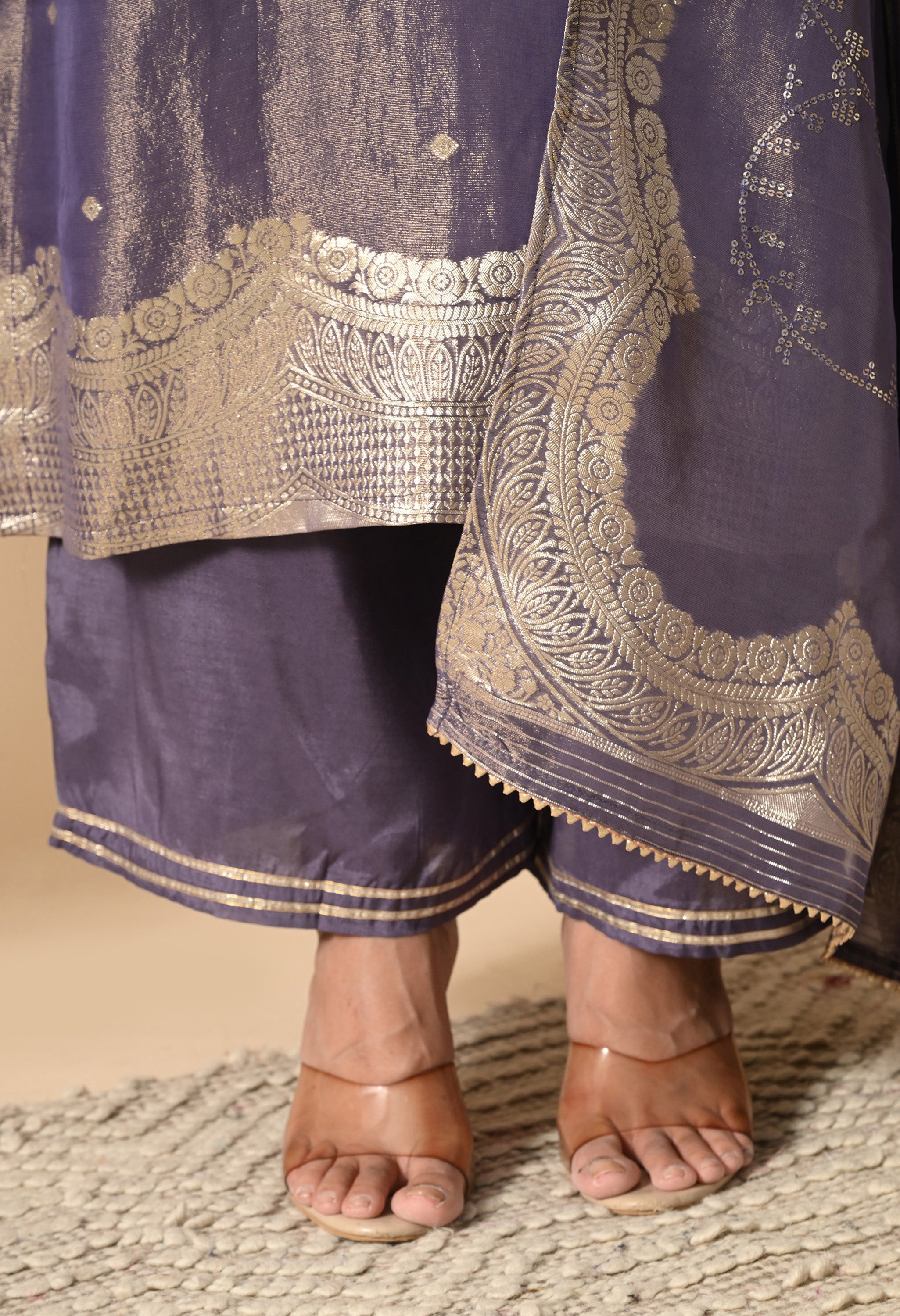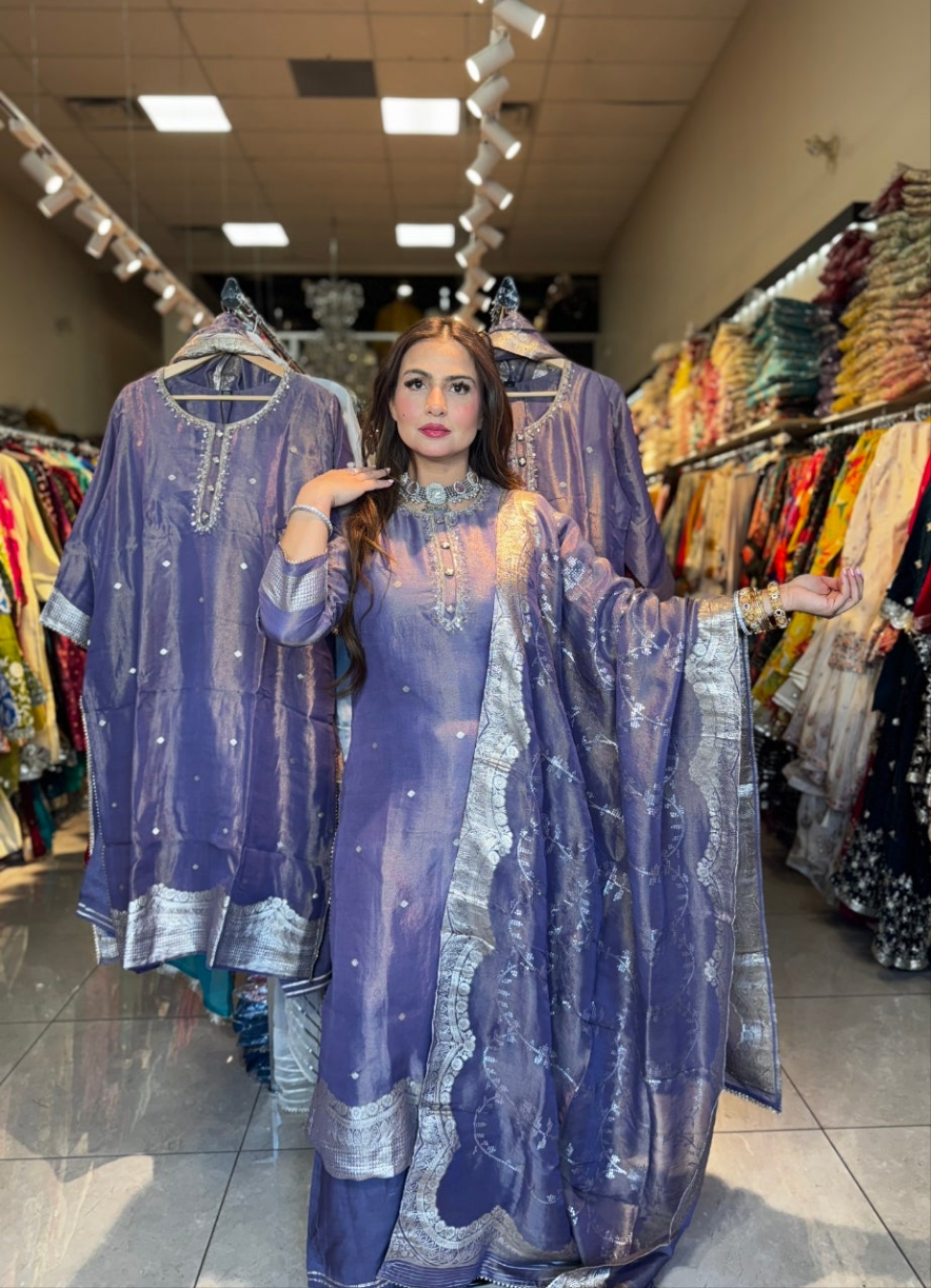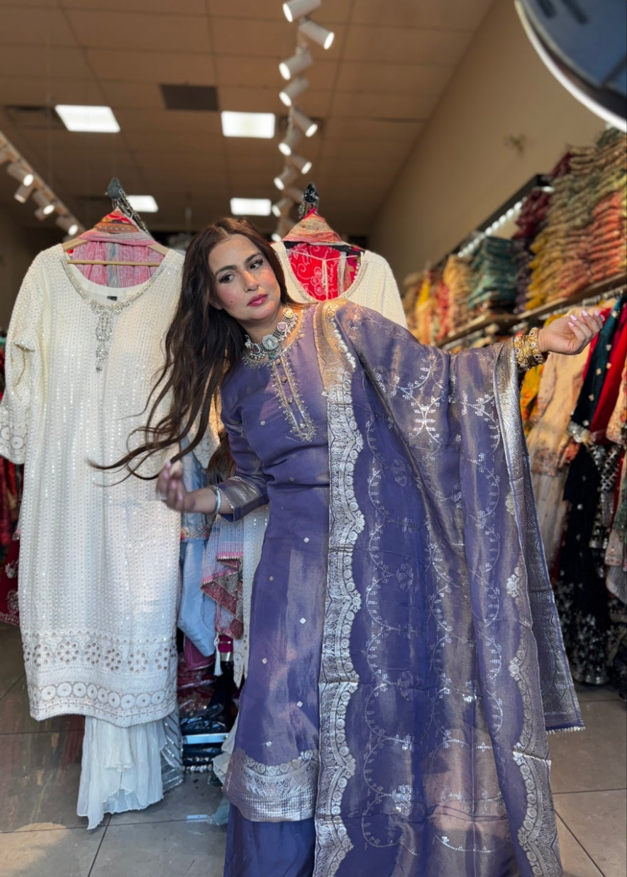 Step into the spotlight with the Chandni Charm Set, a graceful ensemble crafted in luxurious tissue silk. Drenched in an elegant amethyst hue, this outfit shimmers with delicate zari weaving , exuding an understated festive glow.