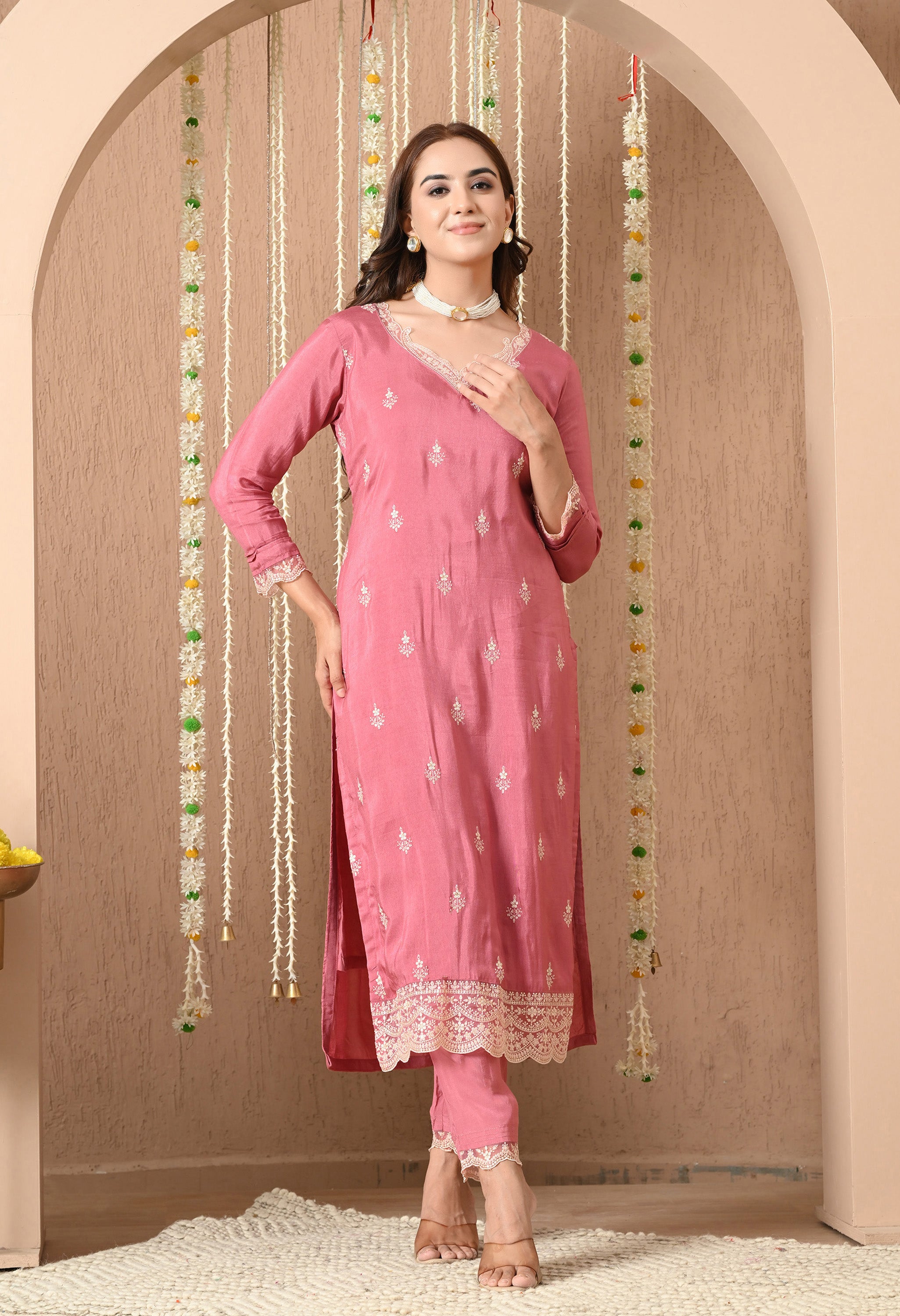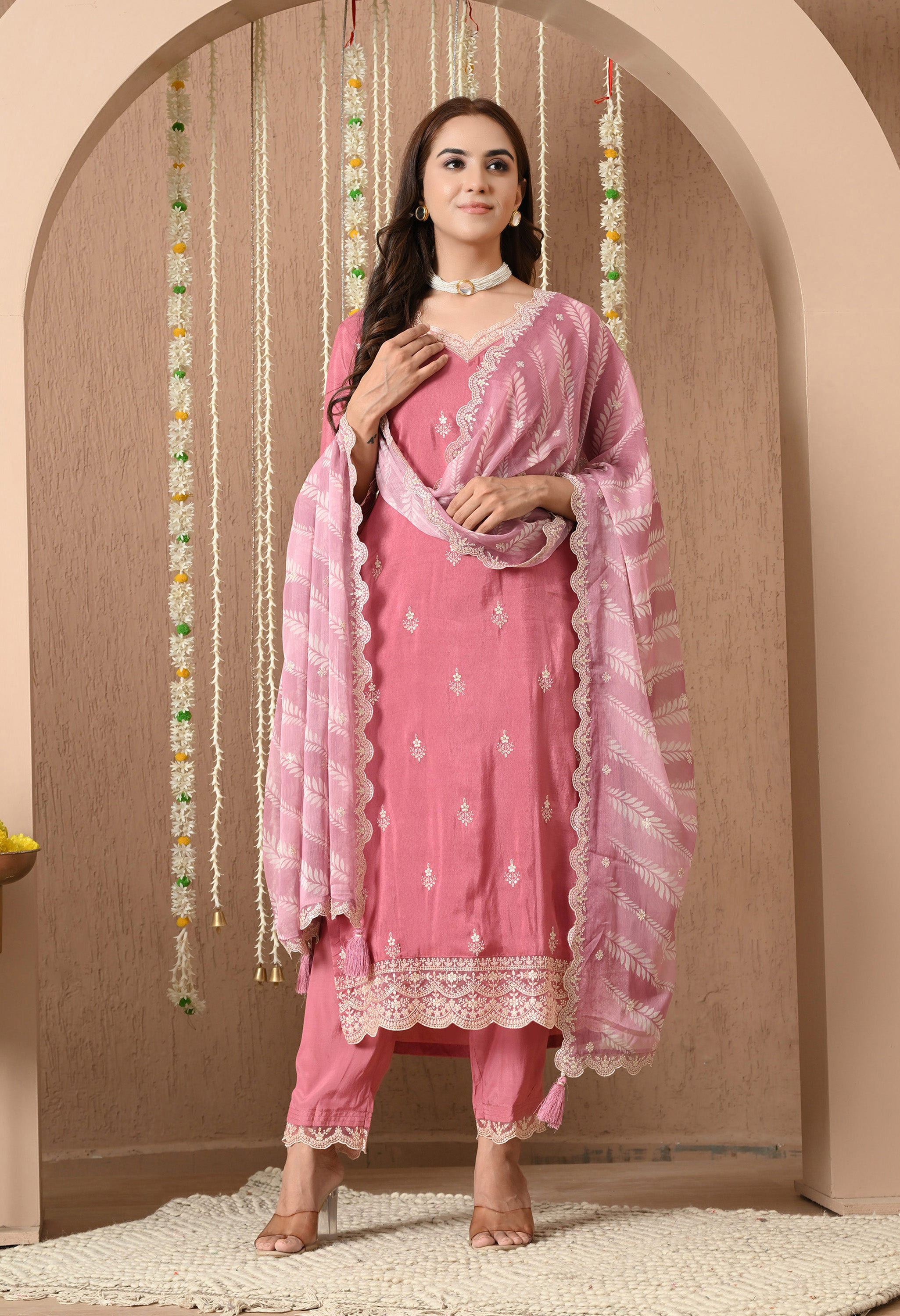 Elevate your ethnic wardrobe with the soft charm of the Gulbahar Dusty Rose Embroidered Suit Set. Crafted in a graceful dusty rose hue, this three-piece ensemble features a straight-cut kurta adorned with delicate thread embroidery and scalloped lace detailing at the hem and cuffs. The matching pants echo the kurta’s elegance with coordinated lace edging, offering a cohesive and refined look. Paired with a beautifully woven striped dupatta featuring this set blends minimalism with sophistication. Ideal for festive brunches, intimate gatherings, or cultural celebrations, this suit set brings effortless elegance to every occasion.