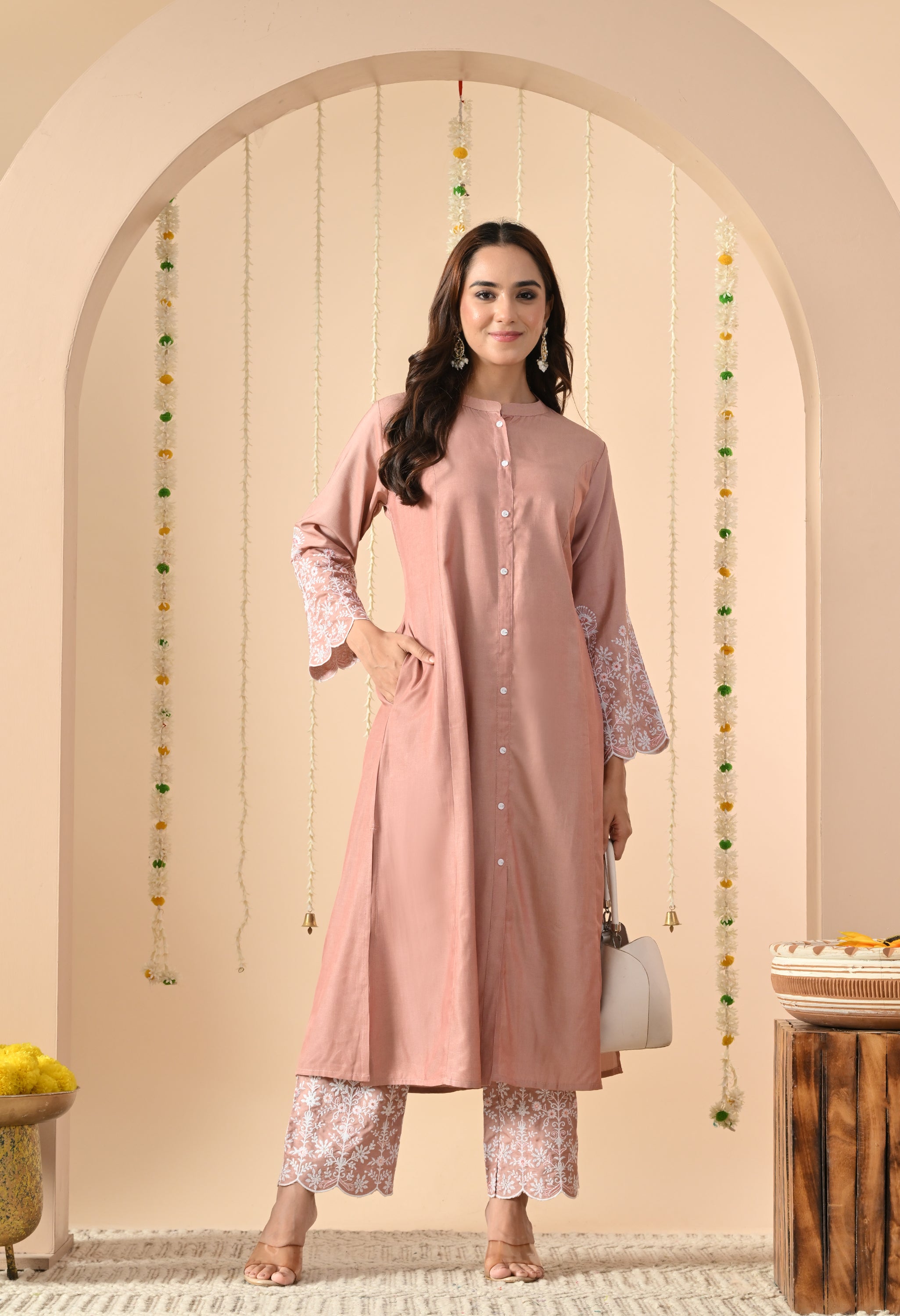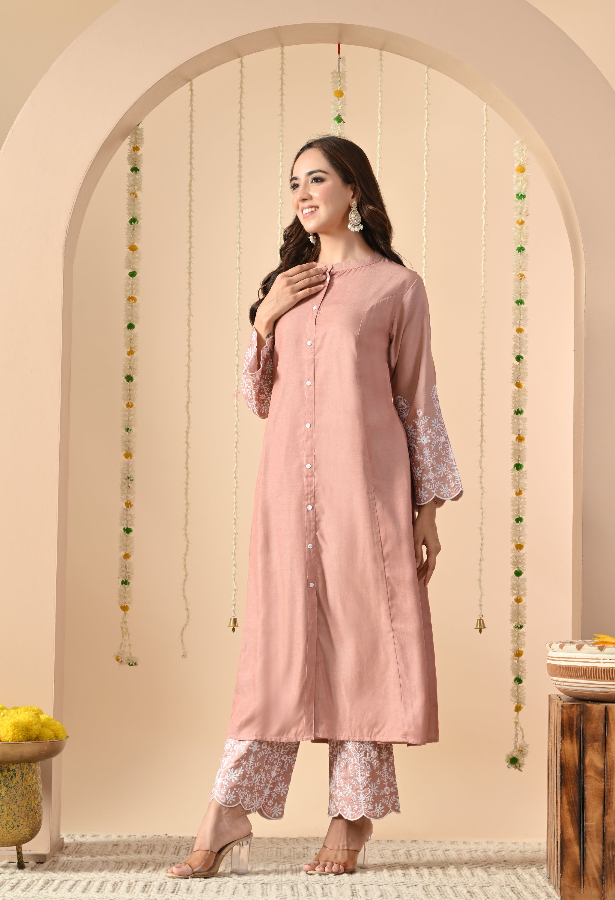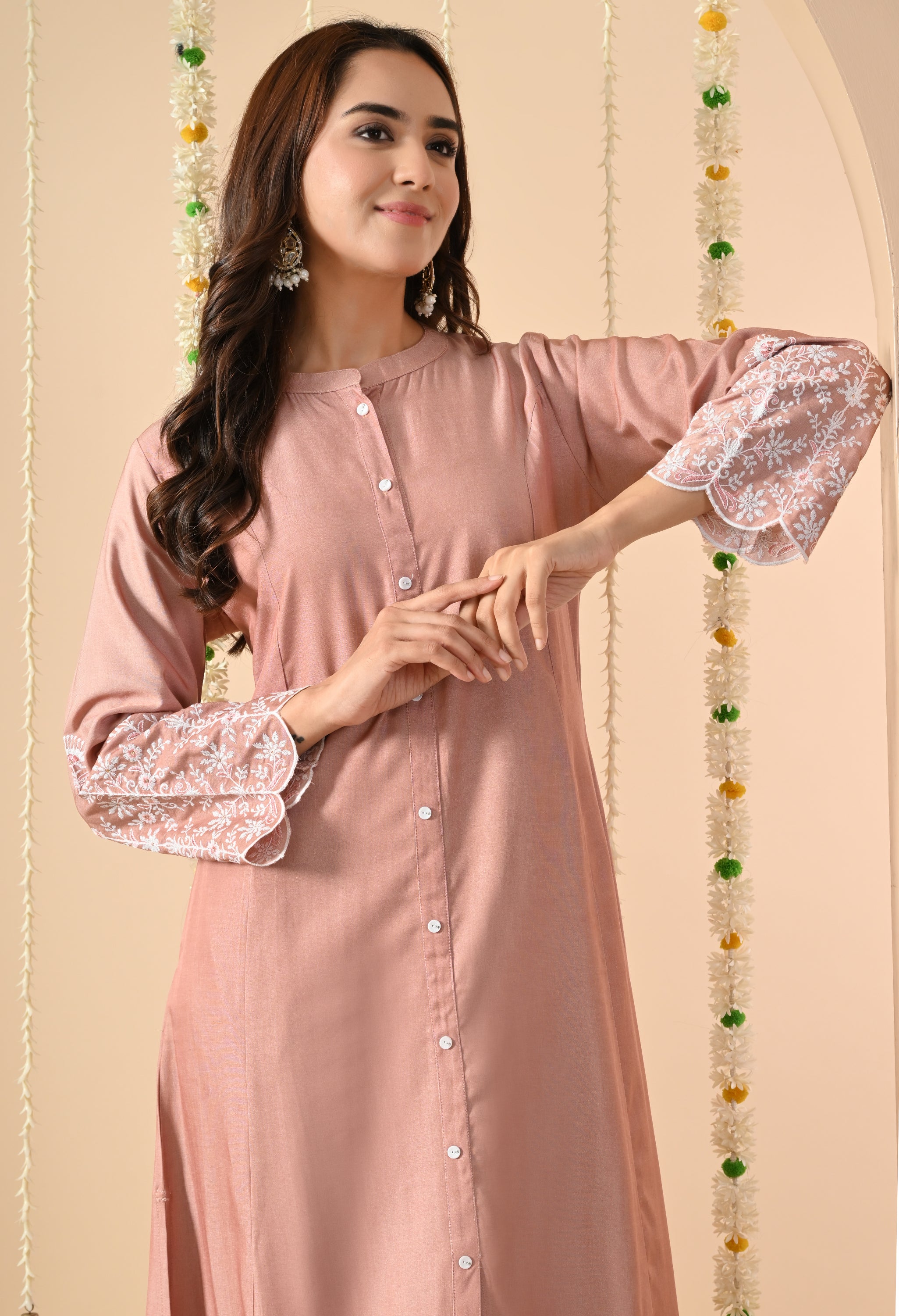 A graceful and elegant Lotus Lily pink straight long kurta, designed with a minimalist button-down front and round neckline. The sleeves are adorned with delicate white thread embroidery and scalloped edges, adding a refined feminine charm.