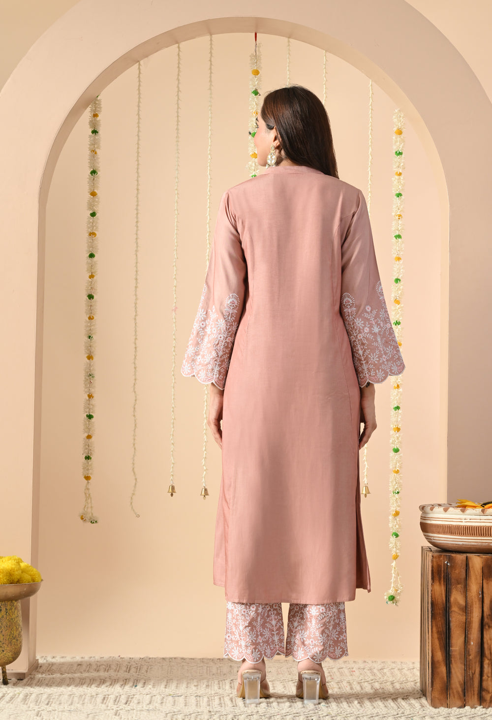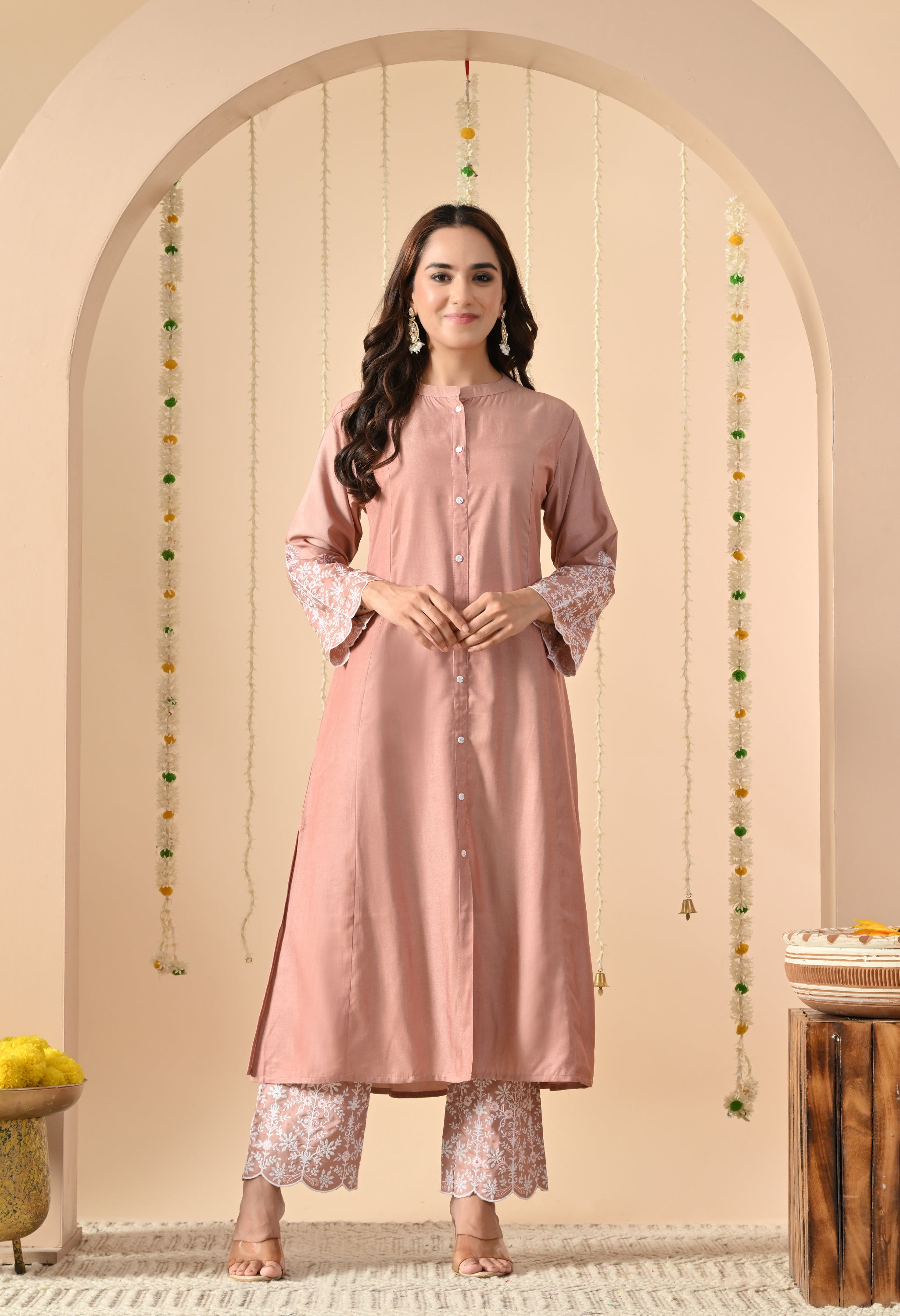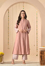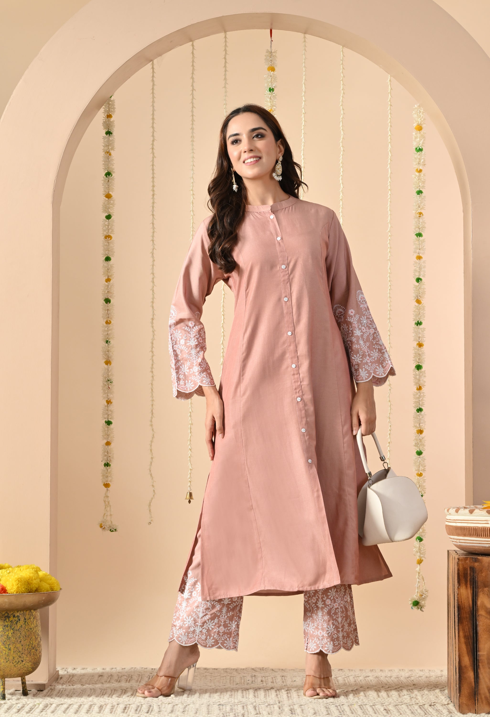A graceful and elegant Lotus Lily pink straight long kurta, designed with a minimalist button-down front and round neckline. The sleeves are adorned with delicate white thread embroidery and scalloped edges, adding a refined feminine charm.