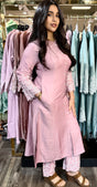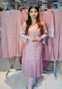 A graceful and elegant Lotus Lily pink straight long kurta, designed with a minimalist button-down front and round neckline. The sleeves are adorned with delicate white thread embroidery and scalloped edges, adding a refined feminine charm.