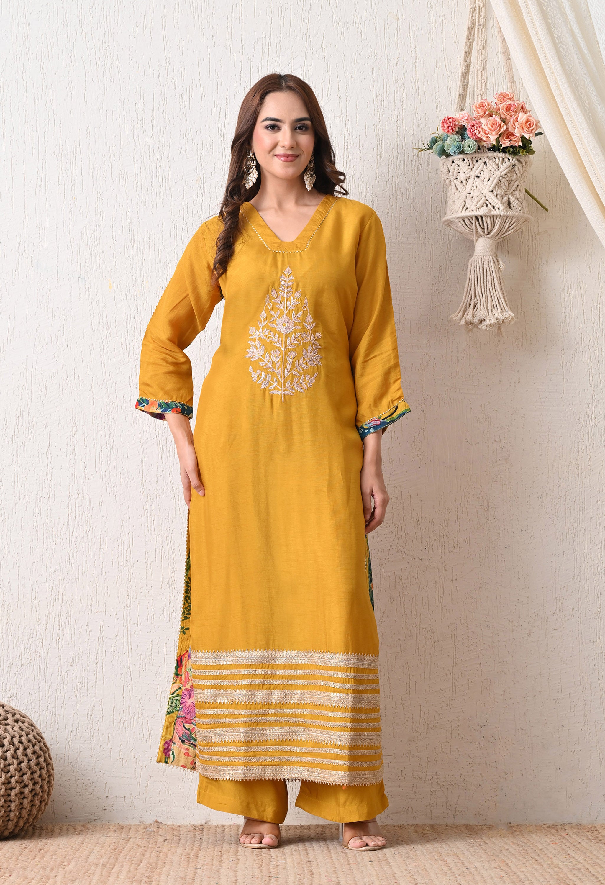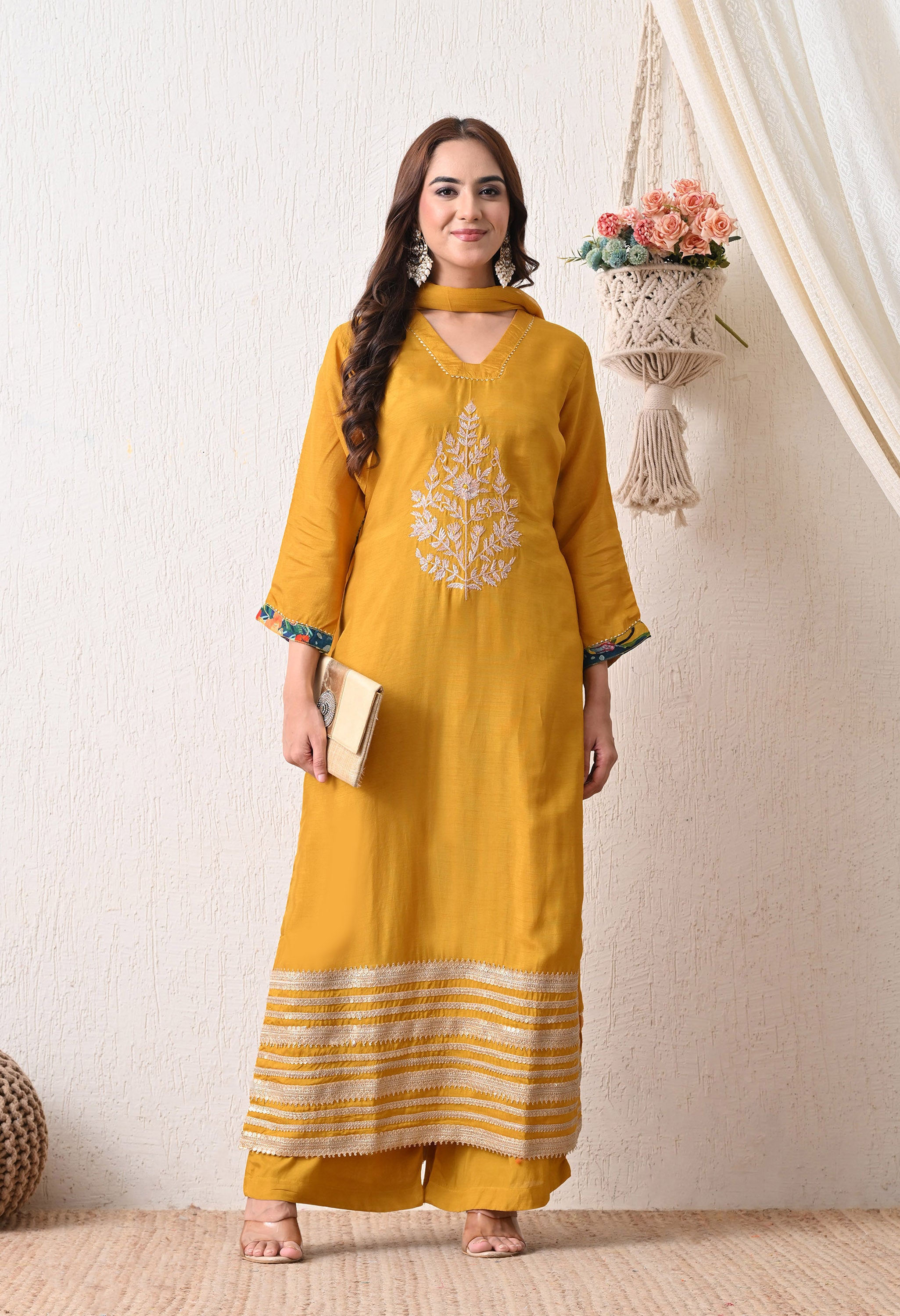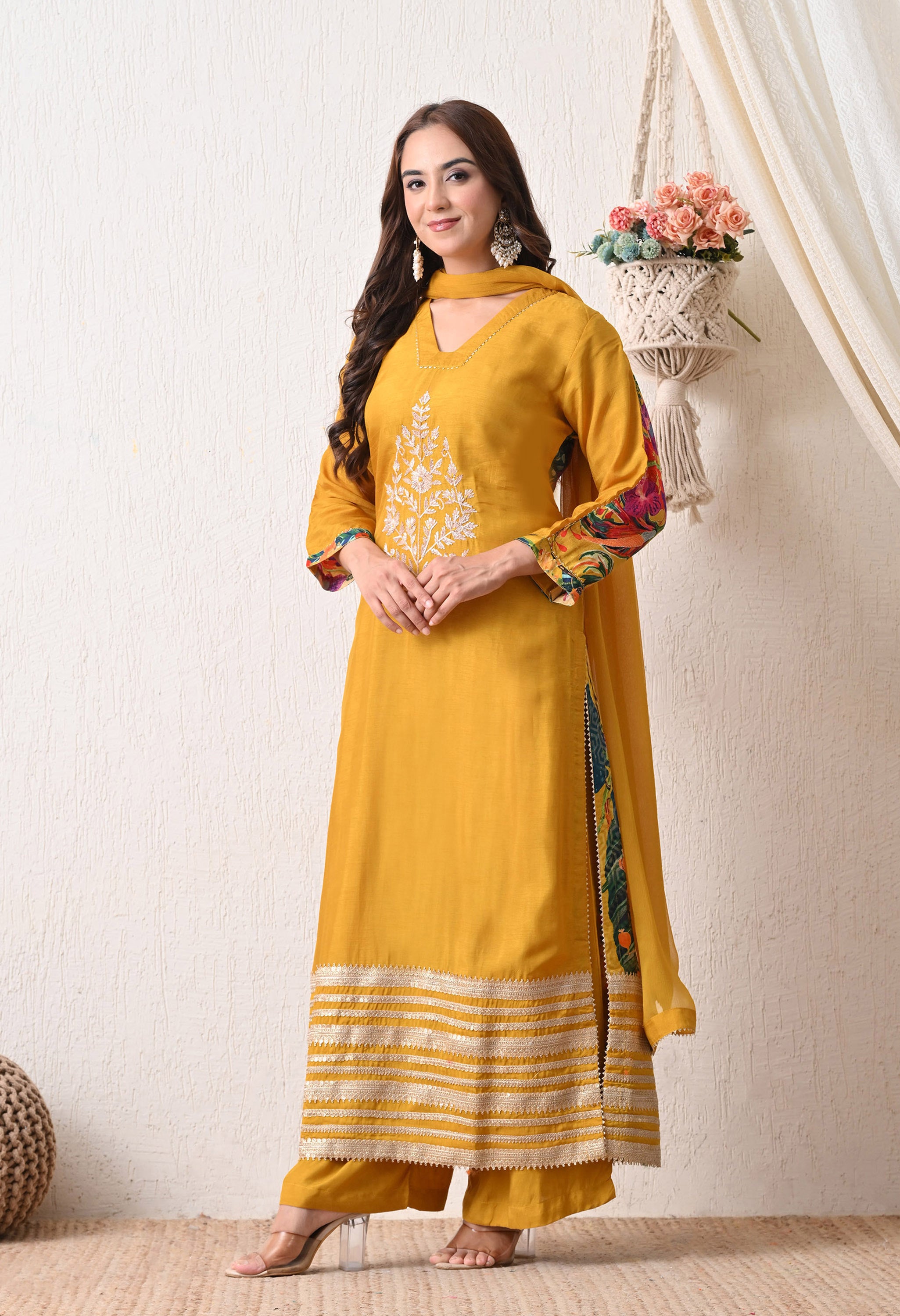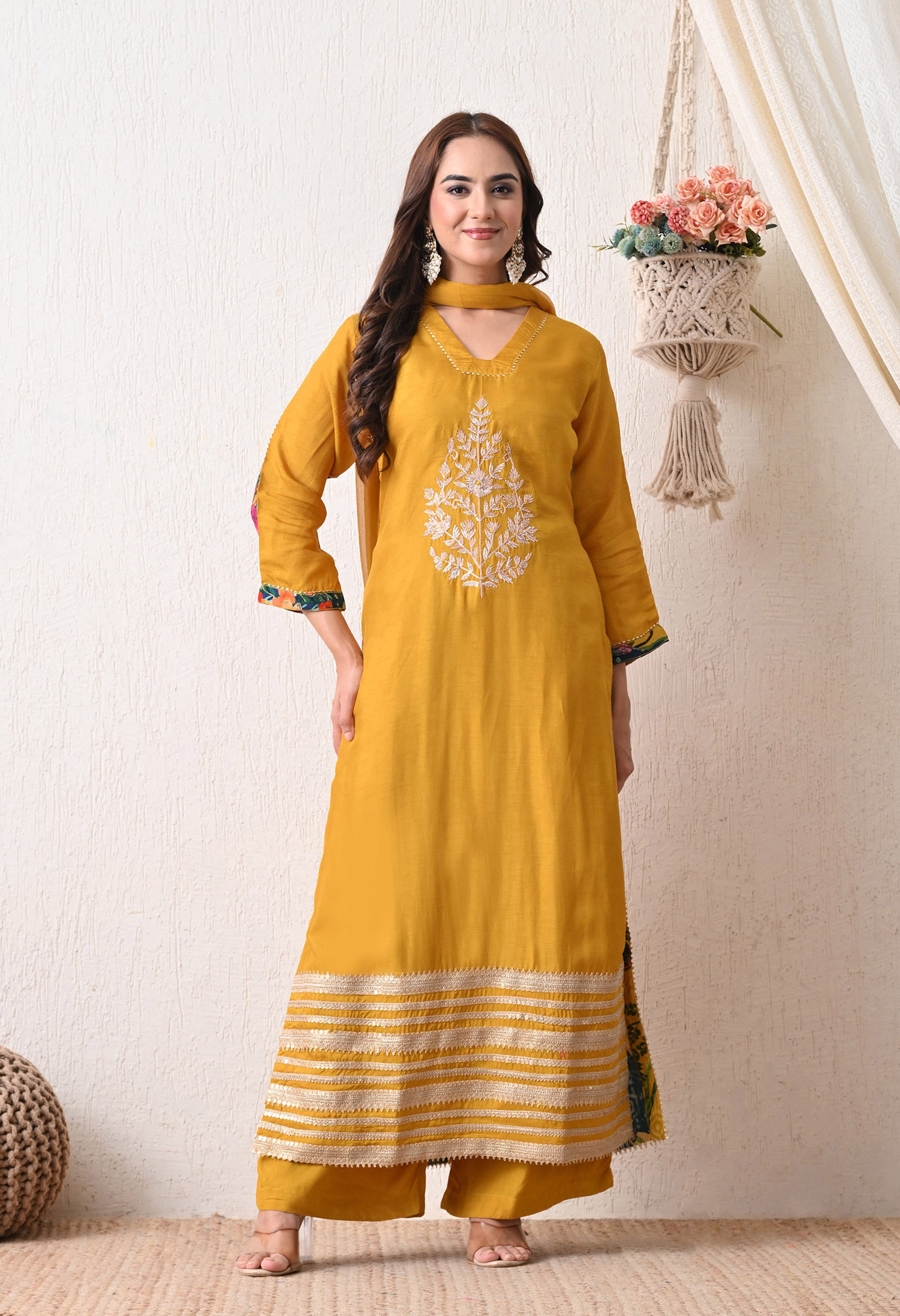 Radiate festive warmth in the Marigold Muse Suit Set, a vibrant ensemble in a rich mustard yellow hue. The kurta features elegant white embroidery at the center and contrasting stripe detailing at the hem for a bold finish. Paired with comfortable plazo pants and a matching dupatta, this set is perfect for haldi ceremonies, festive mornings, or vibrant daytime looks.