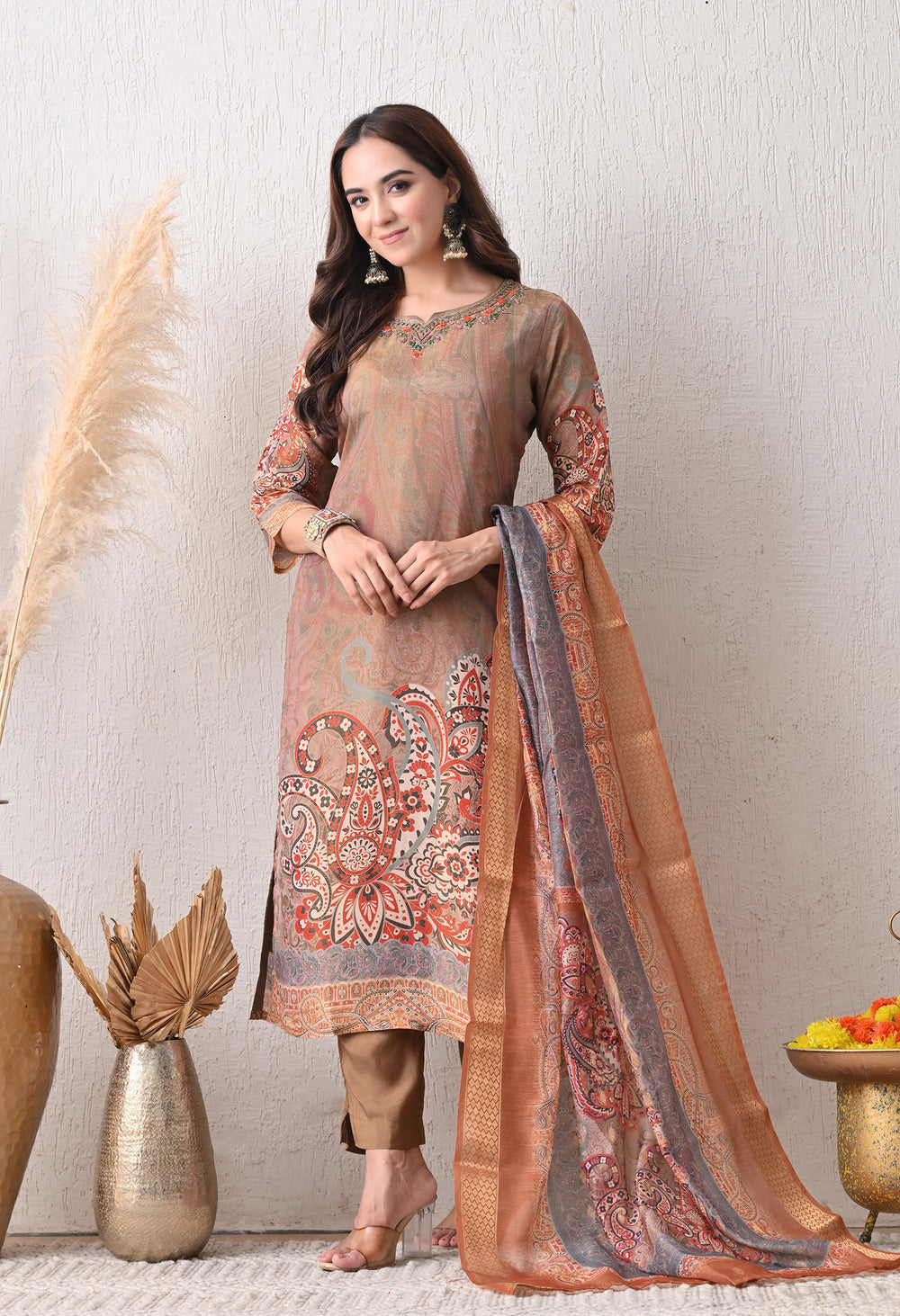 Step into timeless elegance with our Mehfil Suit Set, featuring a beautifully detailed kurta with intricate floral patterns in earthy tones. Paired with a matching dupatta and straight pants, this outfit blends comfort with sophistication. Perfect for festive gatherings, casual outings, or family celebrations, this ensemble adds a graceful touch to your wardrobe.