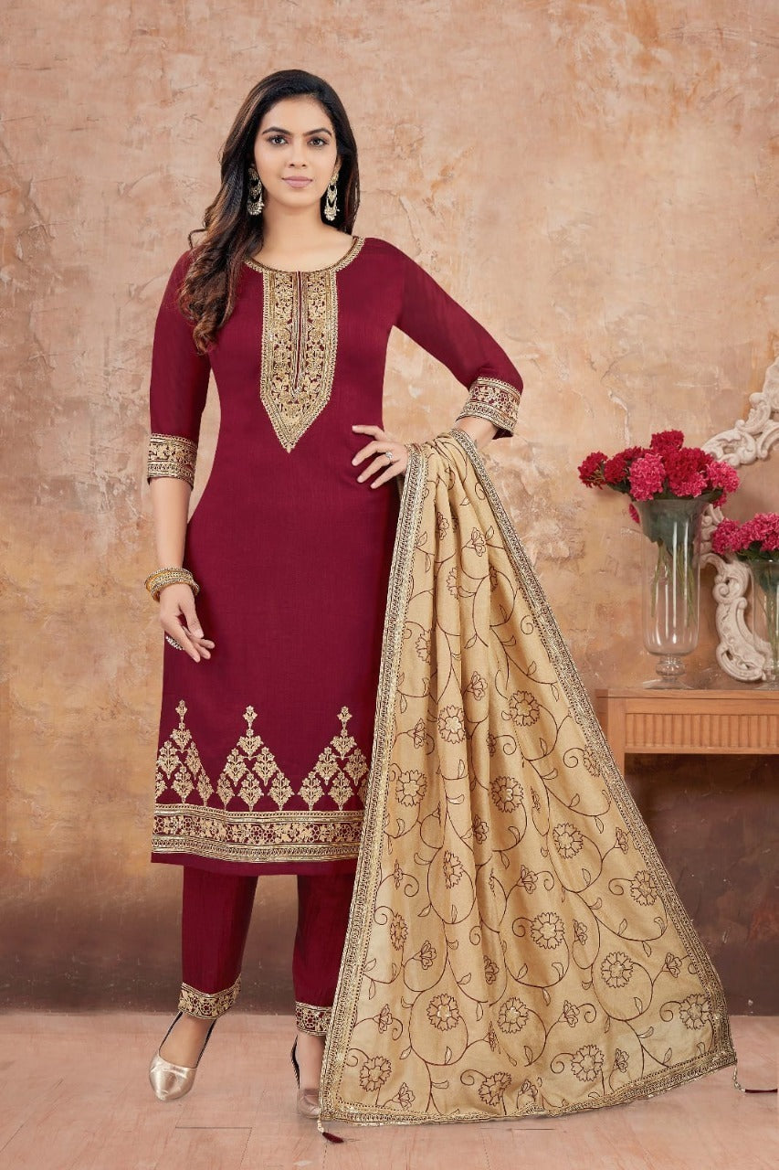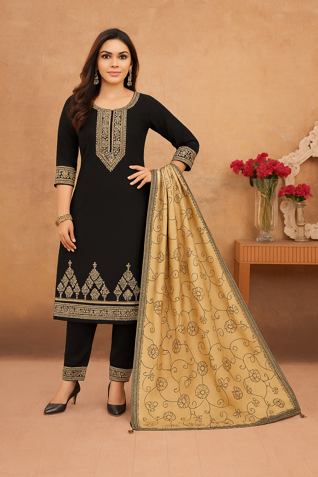 Grace meets elegance in this straight-cut suit adorned with rich golden embroidery. Paired with a beautifully woven dupatta, this ensemble reflects sophistication and is perfect for weddings, festive celebrations, and parties.