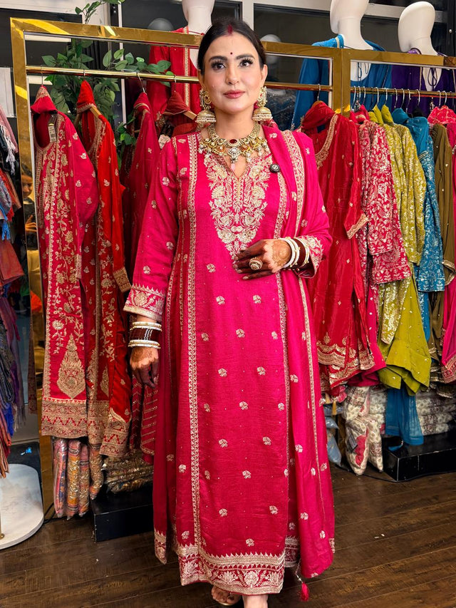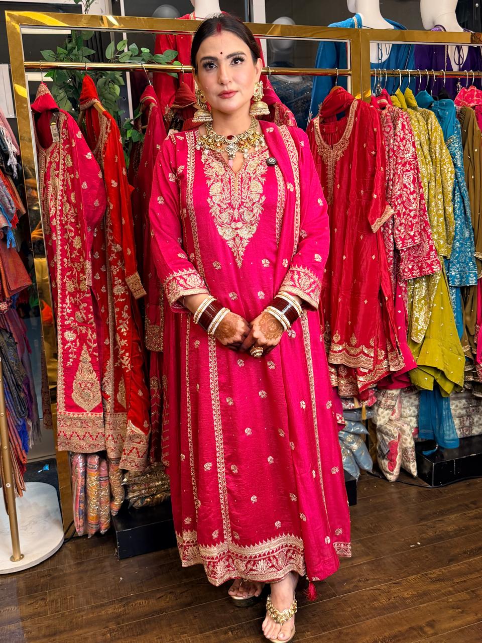 This outfit is a festive showstopper, perfect for weddings, receptions, and grand celebrations. The heavily embroidered Anarkali paired with embroidered straight pants and a graceful dupatta creates a royal and timeless look.