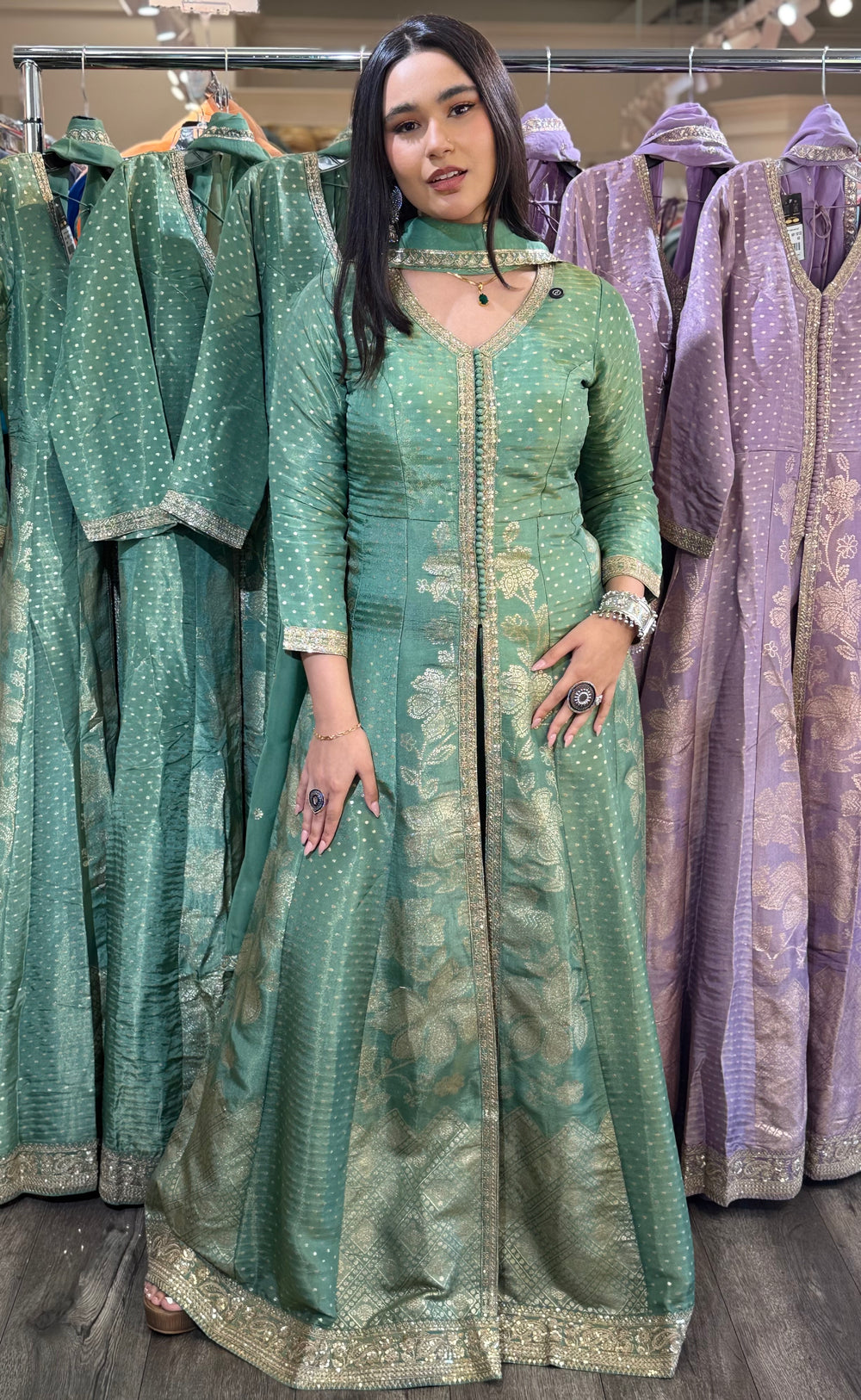 This luxurious ethnic ensemble radiates festive elegance with its rich embroidery and flowing silhouette. Perfect for weddings, parties, or grand celebrations, it offers a regal charm while keeping a modern feminine touch.