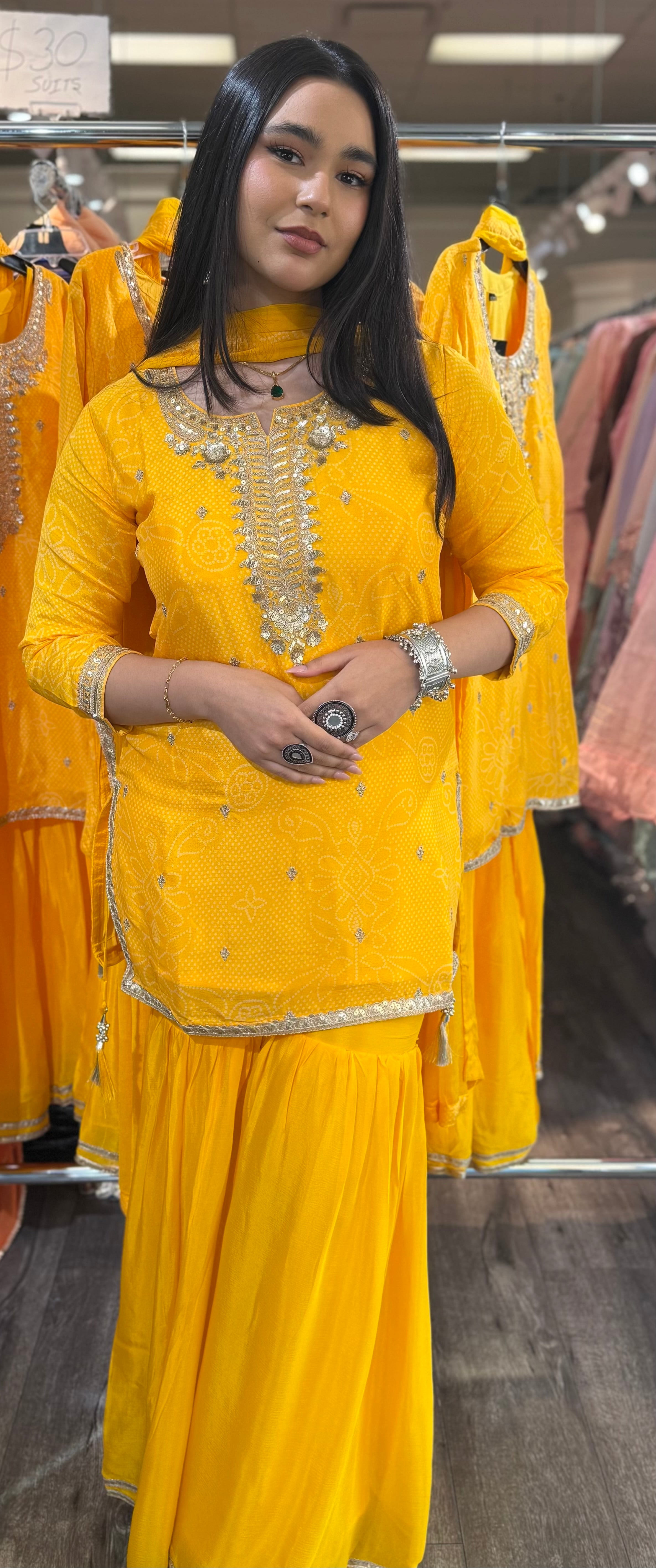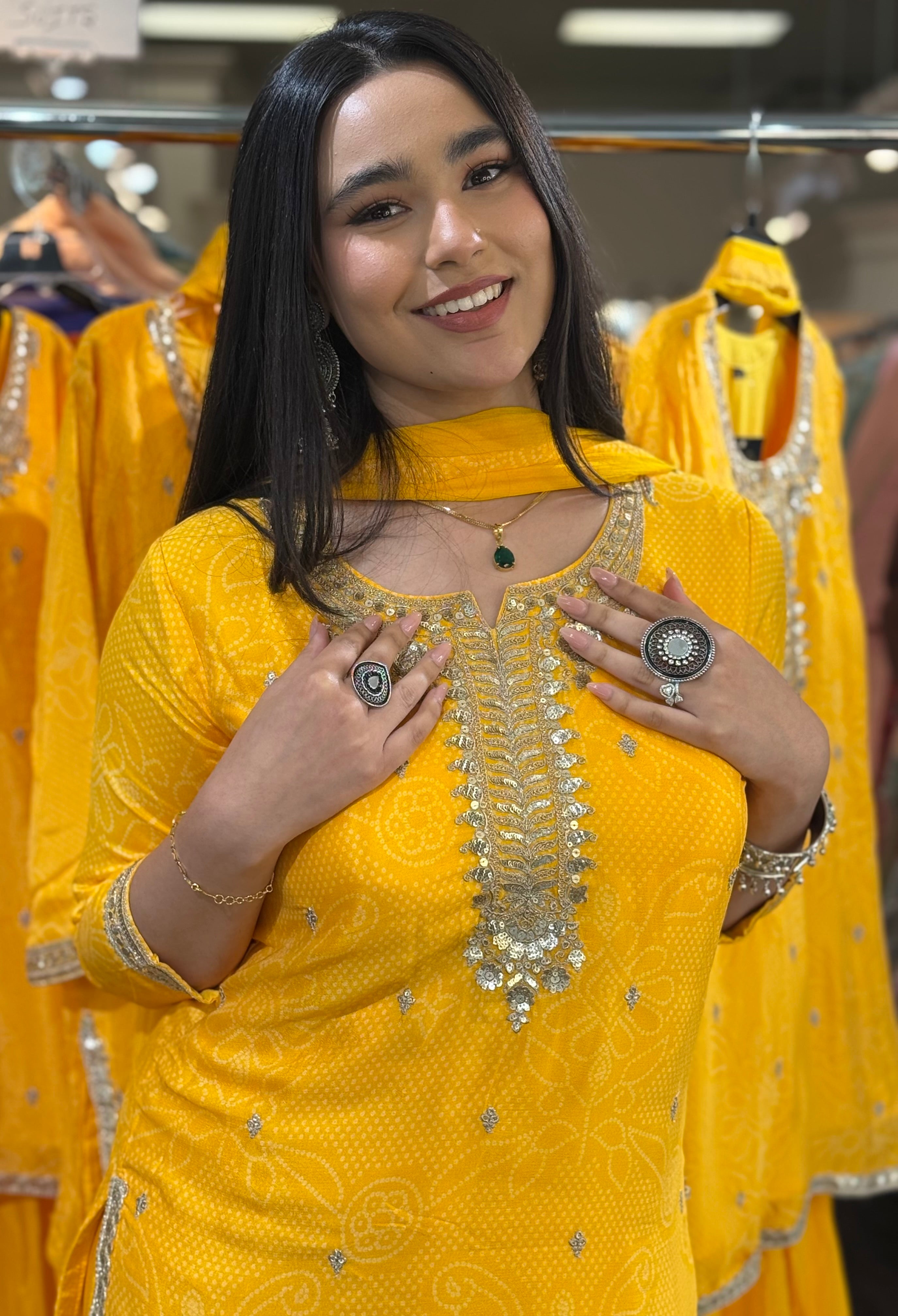 Radiate festive elegance with this stunning Yellow Embroidered Sharara Suit Set,designed to make you stand out at every celebration. The vibrant yellow hue, paired with intricate silver thread and mirror work embroidery, adds a rich traditional charm. Crafted from lightweight georgette fabric, this ensemble offers a graceful drape and all-day comfort.