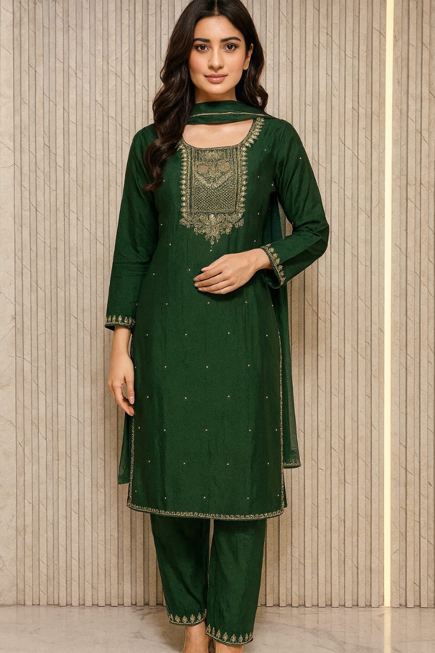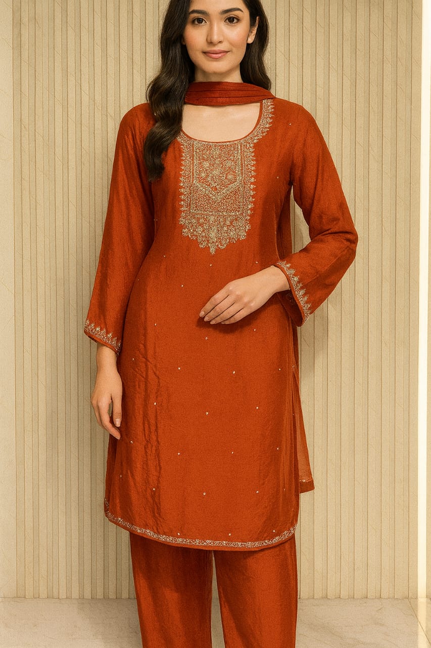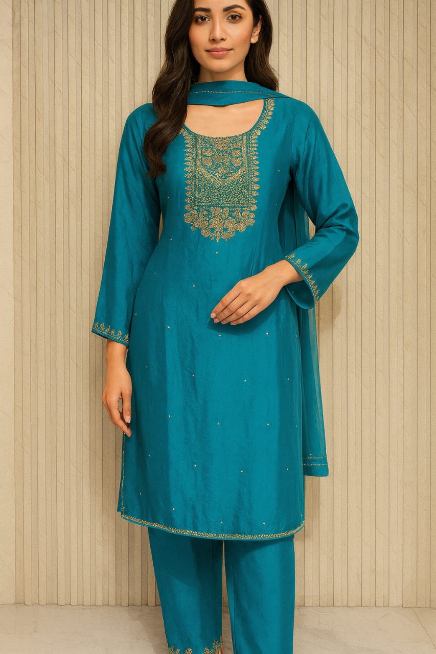 Step into elegance with this stunning suit set, designed to add timeless charm to your festive and formal wardrobe. The kurta features exquisite golden zari embroidery on the neckline and cuffs, creating a regal yet understated look.