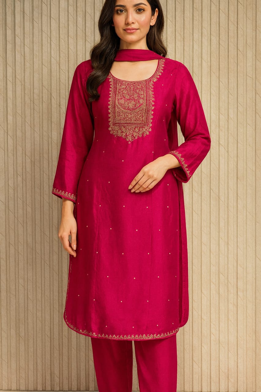 Solid magenta with delicate golden embroidery and dotted embellishments