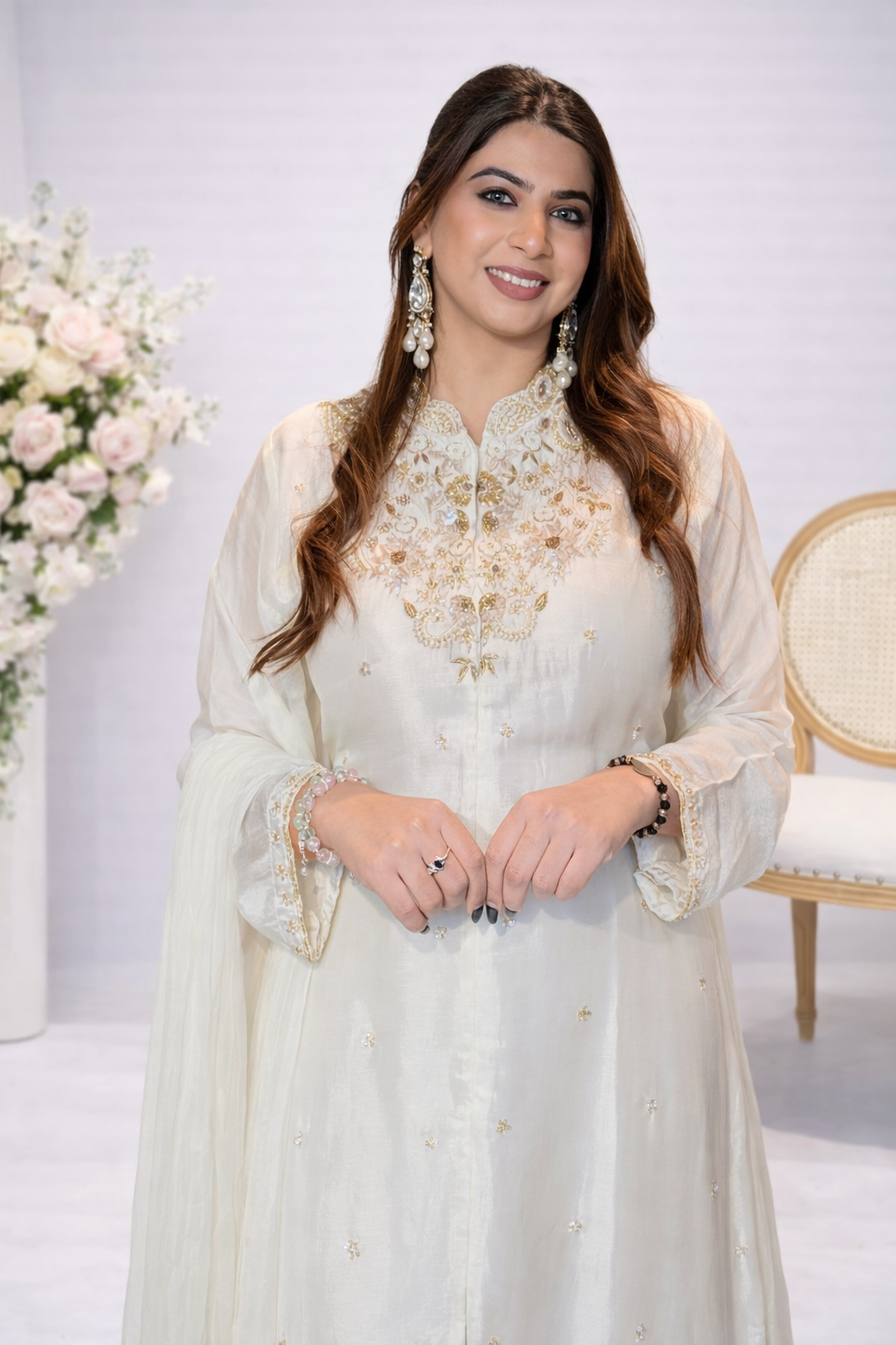Radiate elegance and sophistication in this exquisite emerald embroidered suit set, a perfect choice for festive and formal occasions. The straight-cut kurta is adorned with intricate golden zari embroidery along the neckline, hem, and cuffs, creating a royal and refined look. Delicate floral motifs scattered across the fabric add subtle charm, while the mandarin collar enhances its contemporary appeal.