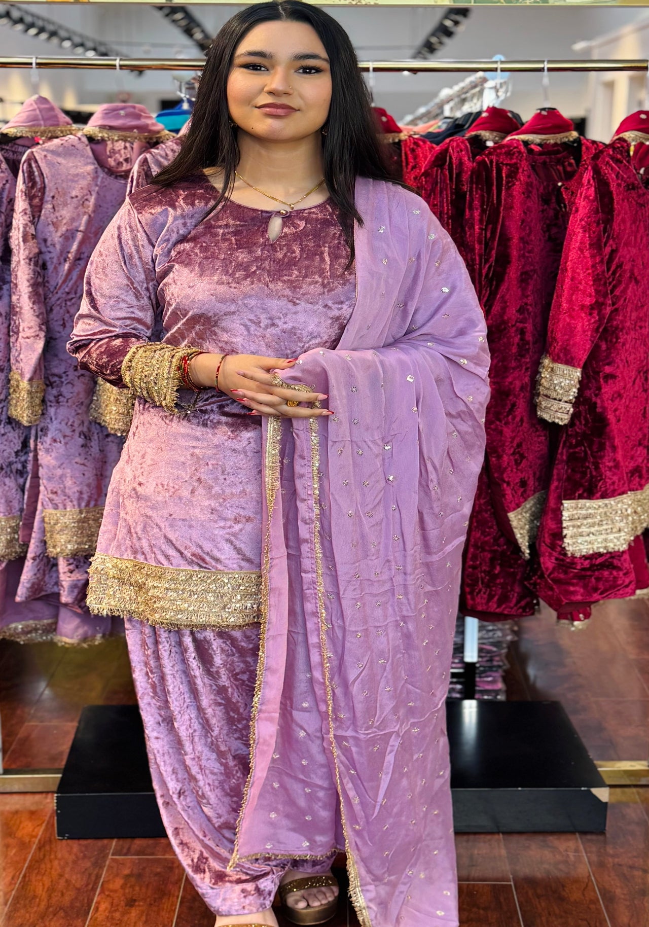 Pattern: Solid velvet with gold lace & sequin detailing on hem and sleeves