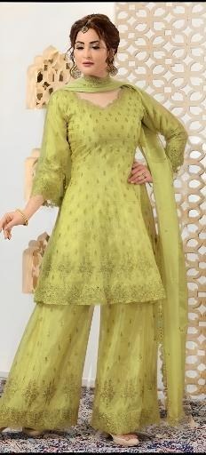 Step into timeless elegance with this beautifully designed golden Sharara suit. Perfect for festive occasions, weddings, and special gatherings, this outfit exudes sophistication with its luxurious shine and intricate embroidery.